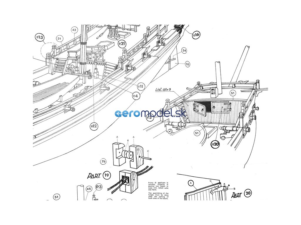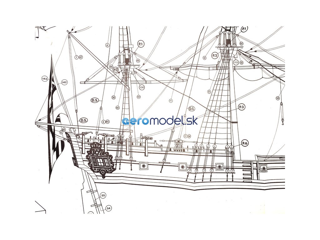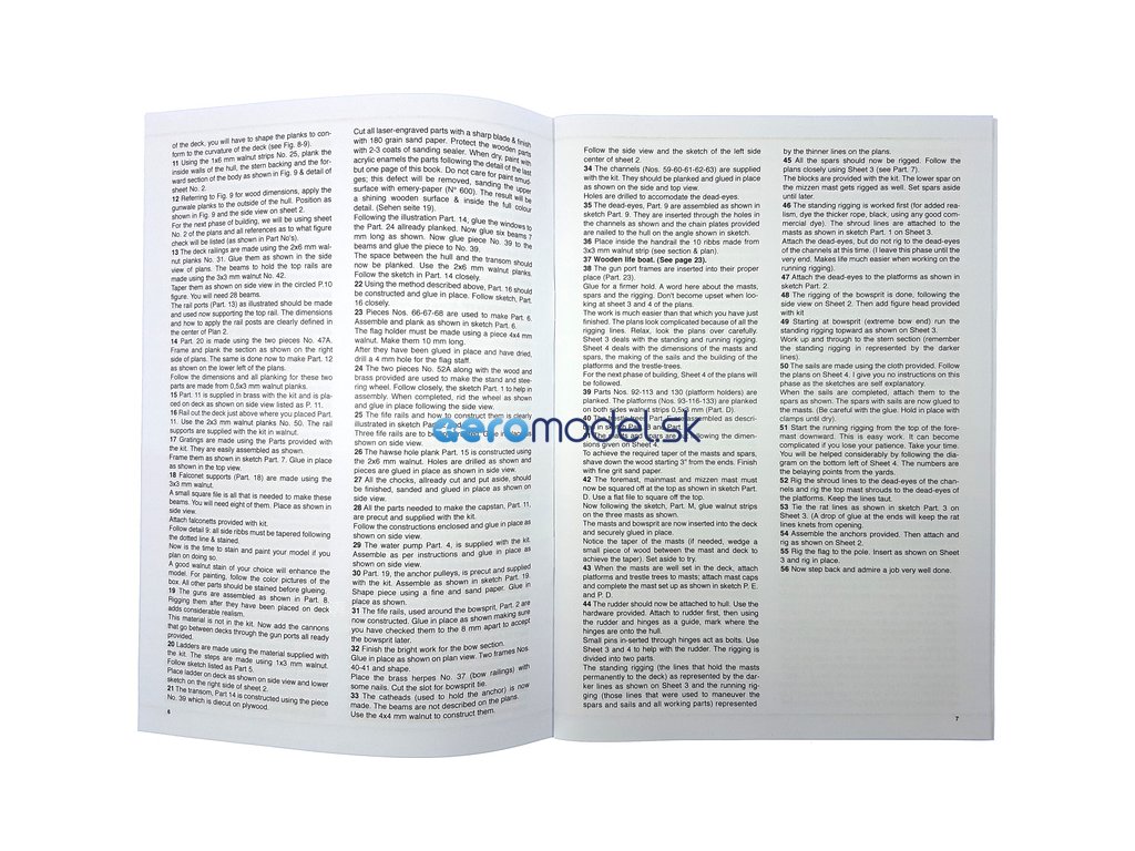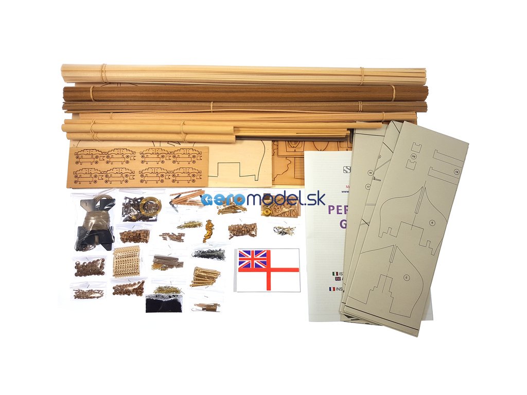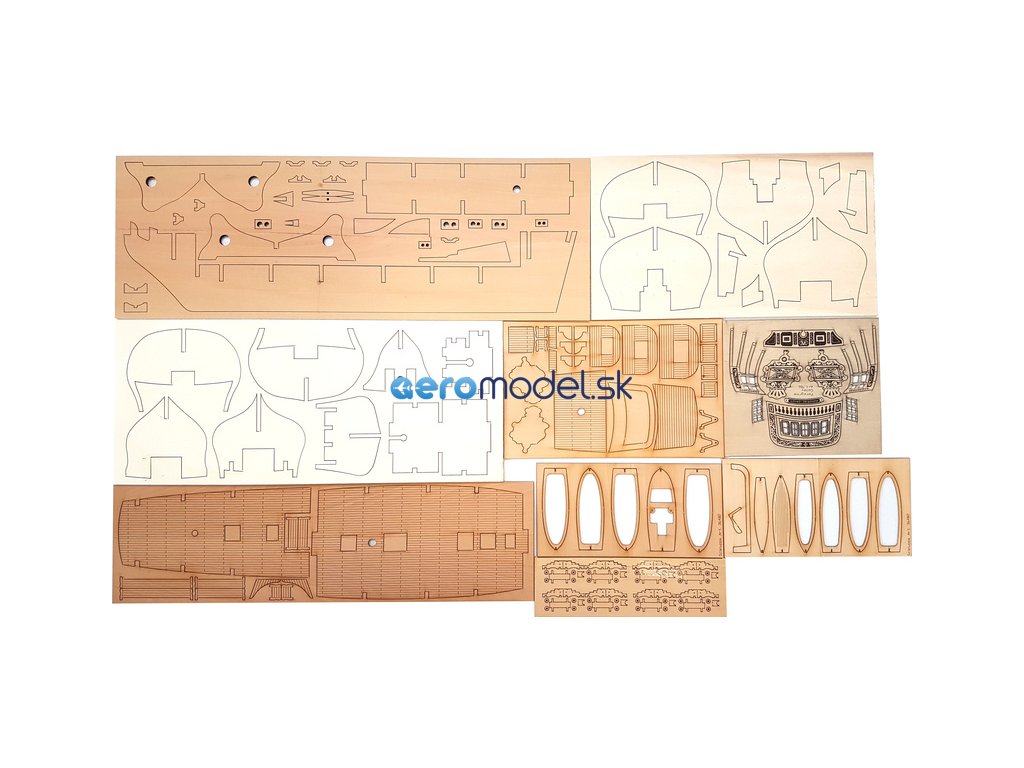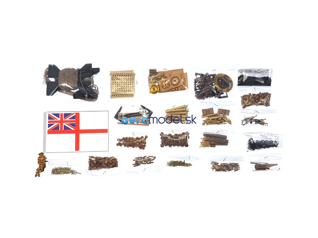 Balení obsahuje laserem řezané dřevěné díly, plaňky, paluby, sady lišt různých průřezů, kovové odlitky, motouzy, drobné součásti, vlajku atd. Stavební plán a vícejazyčný manuál.