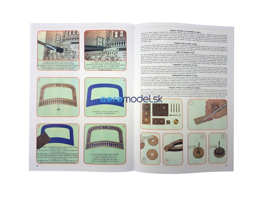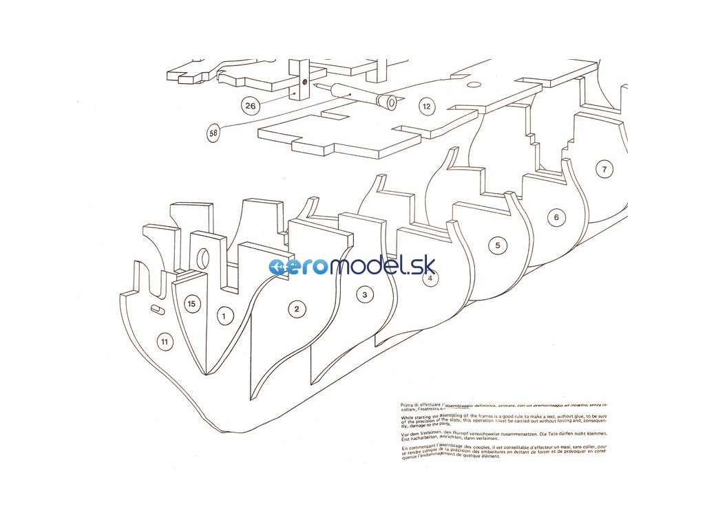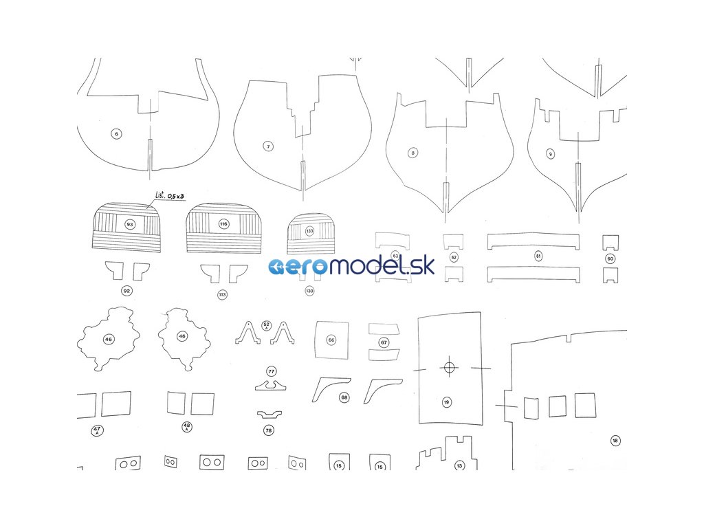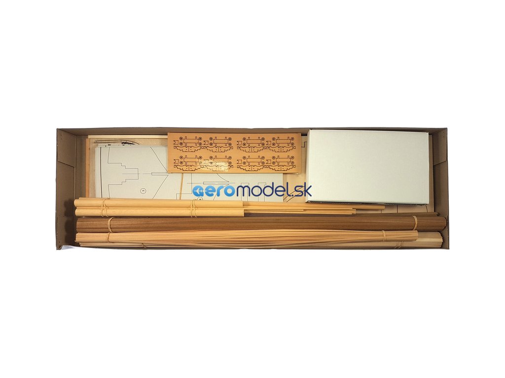 Po otevření víka krabice naleznete dřevěné díly modelu z překližky, lišty, drobné součásti v plastových sáčcích a manuál.