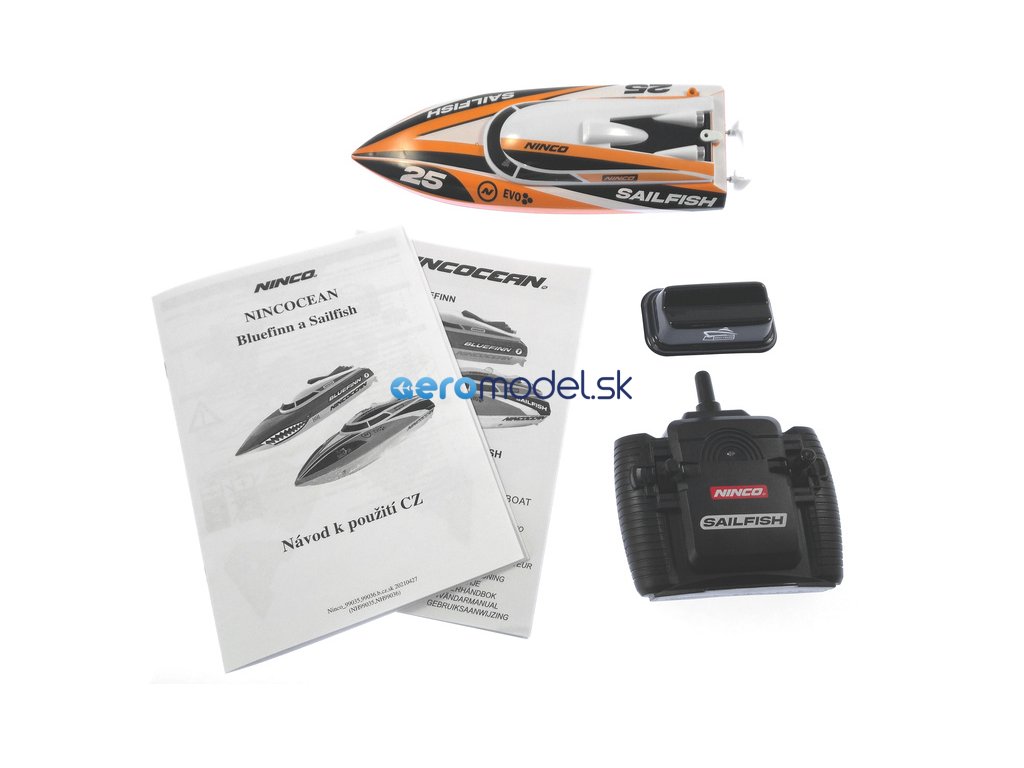 Balenie obsahuje loď na diaľkové ovládanie NINCOCEAN Sailfish, 2,4 GHz vysielač. Návod CZ a manuál EN, ES, PT, DE, FR, IT, DK, NO, FI, SV, NE.