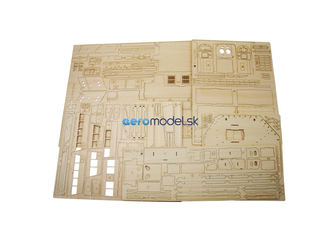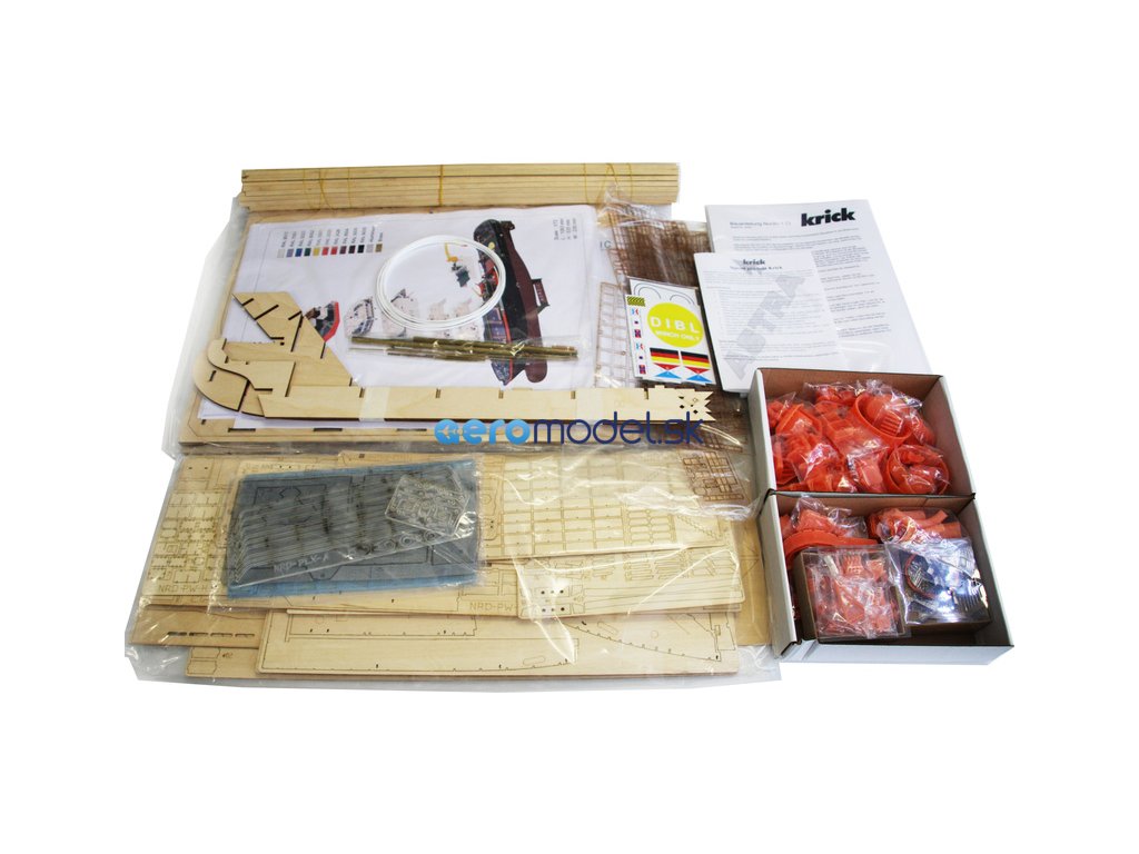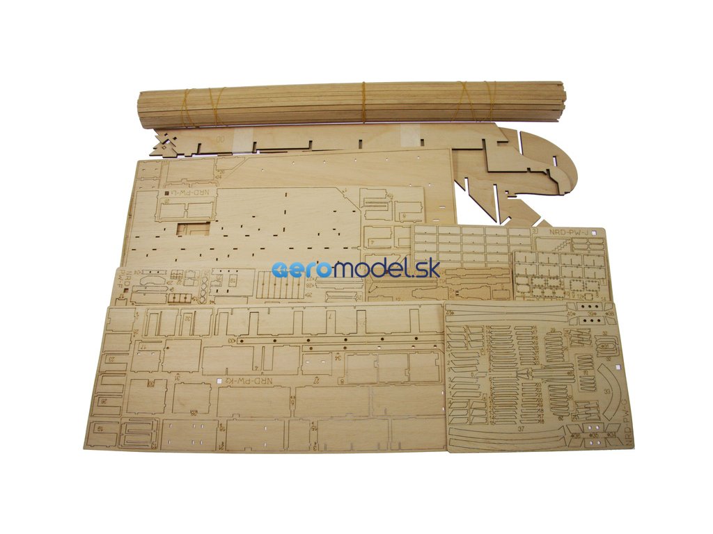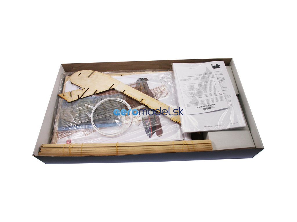 Po otevření víka krabice naleznete dřevěné díly modelu z překližky, sadu lišt, drobné součásti uzavřené v sáčcích, sadu výkresů a manuál.