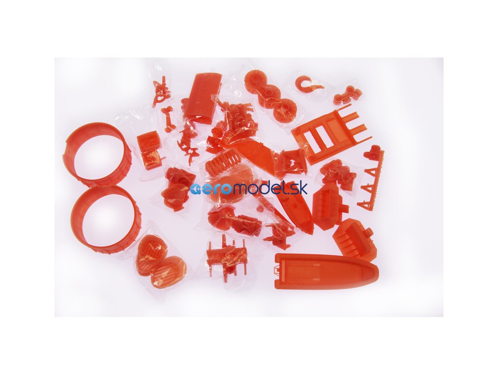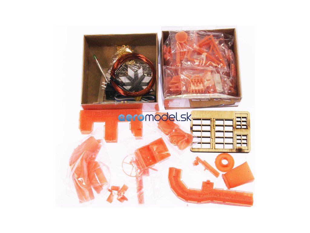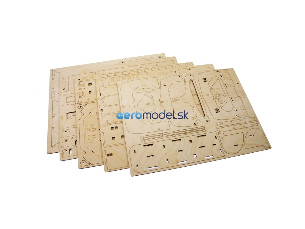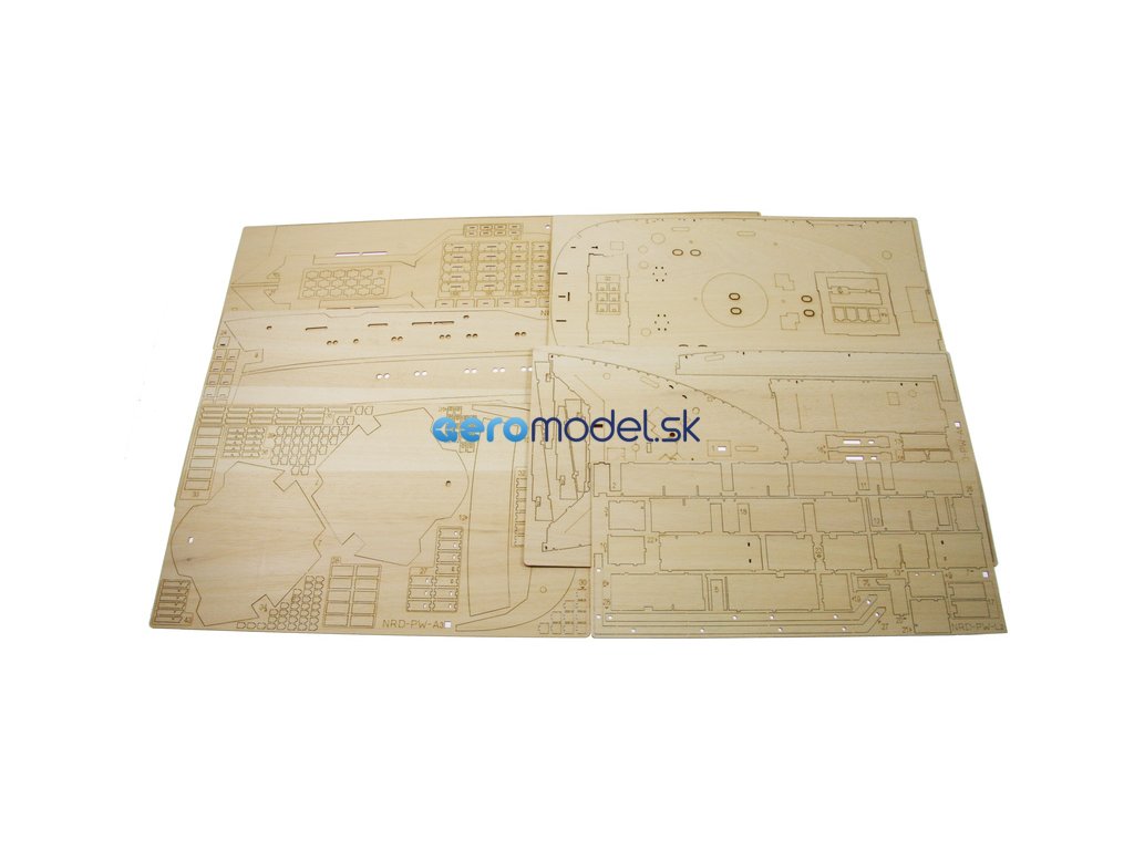 Po otevření víka krabice naleznete dřevěné díly modelu z překližky, sadu lišt, drobné součásti uzavřené v sáčcích, sadu výkresů a manuál.