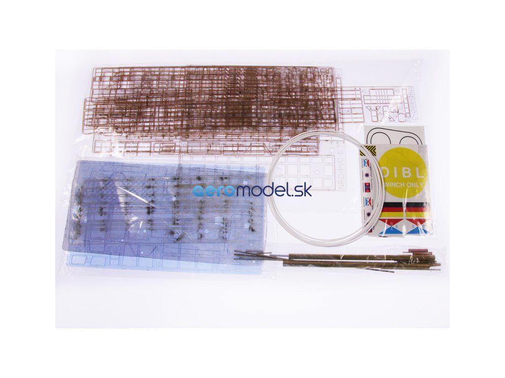 Balení obsahuje díly pro stavbu lodi: díly překližky, lišty z Abachi, laserem řezané dřevěné díly, maketové díly 3D tisku. Obrázkový manuál EN.