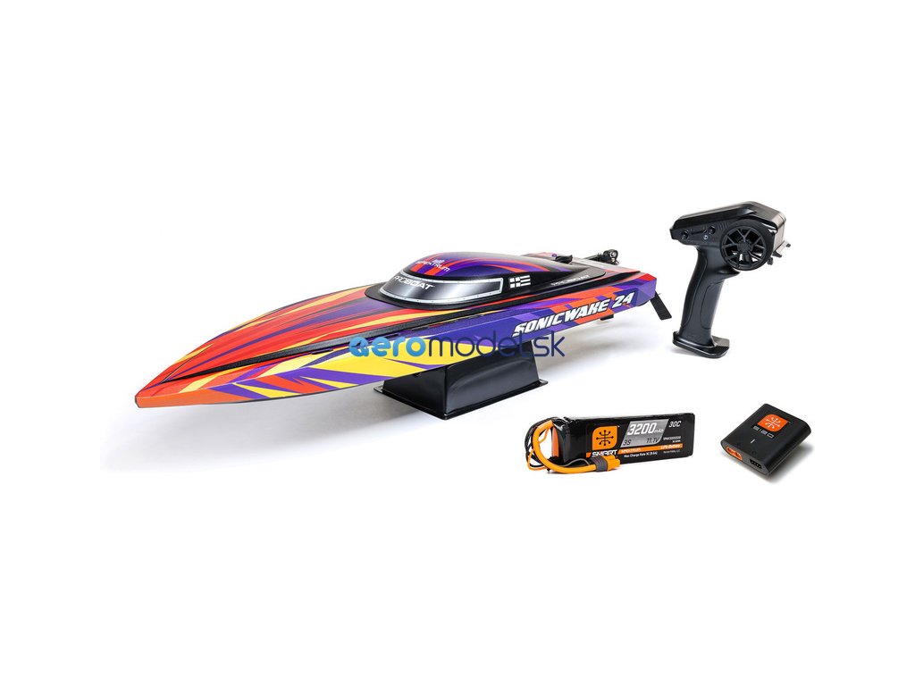 V balení je obsažena hotová sestavená loď Sonicwake 24" s nainstalovanými komponenty: motor střídavý Firma™ 3542 2500Kv Outrunner Marine 3.175mm, Spektrum regulátor Marine 50A, servo analogové 5.3 kg.cm a Spektrum přijímač SR215 DSMR/SLT 2CH. Vysílač Spektrum SLT2 2.4GHz, akumulátor Spektrum Smart LiPo 11.1V 3200mAh 3S 30C, nabíječ USB-C Spektrum S120. Příslušenství: 4x AA baterie do vysílače, stojánek na loď, návod v češtině a manuál EN, DE, FR, IT.