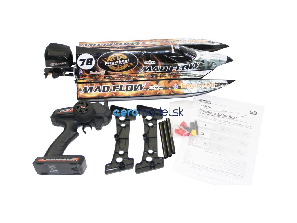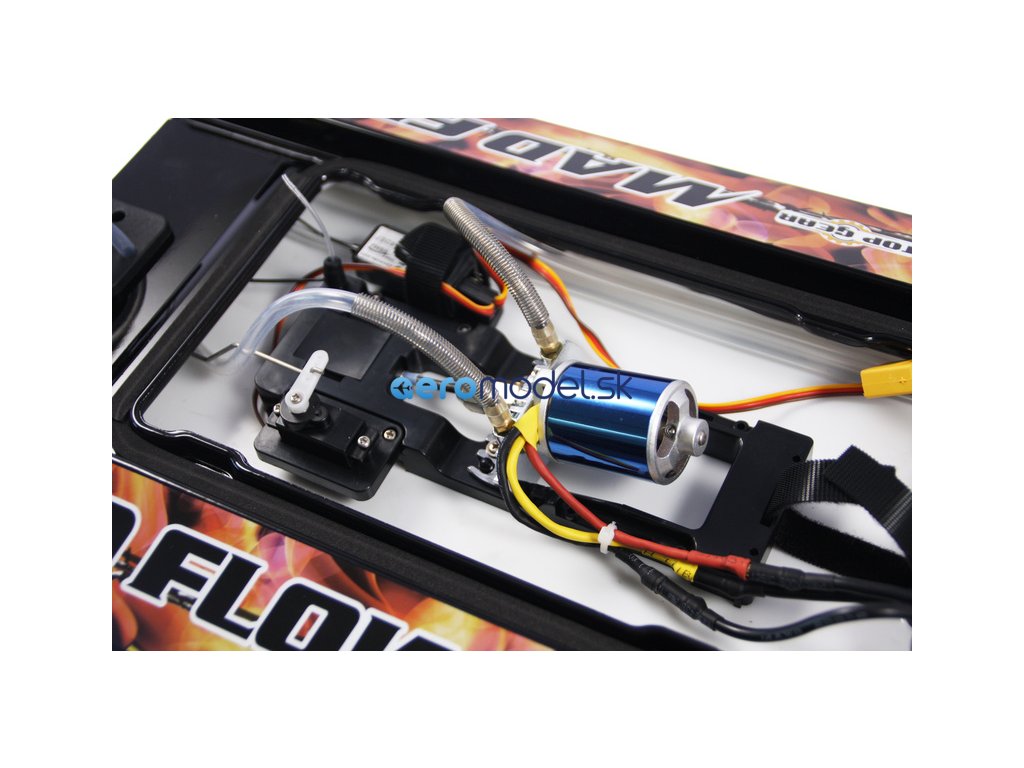 Hotový zostavený namaľovaný RC model Mad Flow Brushless V3 s nainštalovaným vodou chladeným striedavým motorom, 30A vodou chladeným striedavým regulátorom, 9g vodotesným servom s MG a 2,4HGz prijímačom, Súčasťou balenia je náhradná vrtuľa, balónik prijímača, konektor batérie XT60 so zmršťovacou fóliou, imbusové skrutky 2 mm a 2,5 mm, sťahovacie pásky, mechové gumičky, vysielač Joysway 2,4 GHz FHSS, stojan a návod.