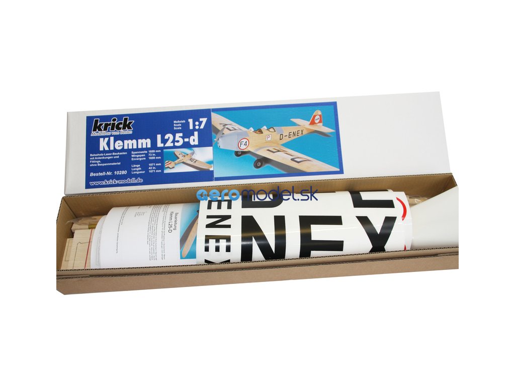 Stavebnice německého sportovního a cvičného letadla z třicátých let minulého století, Klemm L 25d v měřítku 1:7, provedení Kit. Rozpětí modelu je 1859mm. Kryt motoru je ABS, pro nízkou hmotnost je model vhodný k instalaci elektropohonu. Vhodnou alternativou by mohl být i spaalovací motor 4T/2T o objemu 10ccm.