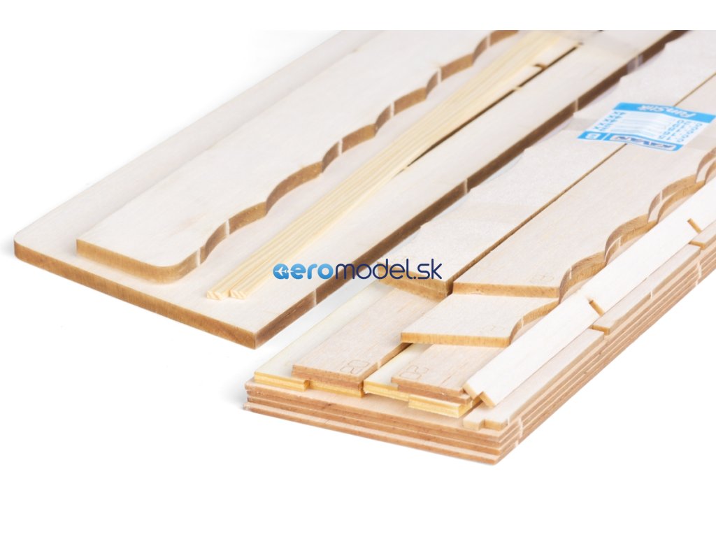 Stavebnice obsahuje: laserem vyřezávané balsové a překližkové díly, smrkové nosníky, balsové nosníky a prkénka na tuhý potah, sadu příslušenství, duralový podvozek, lehká kola, arch samolepících obtisků, stavební plán a návod.