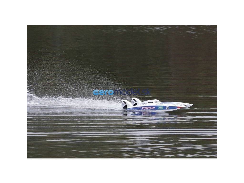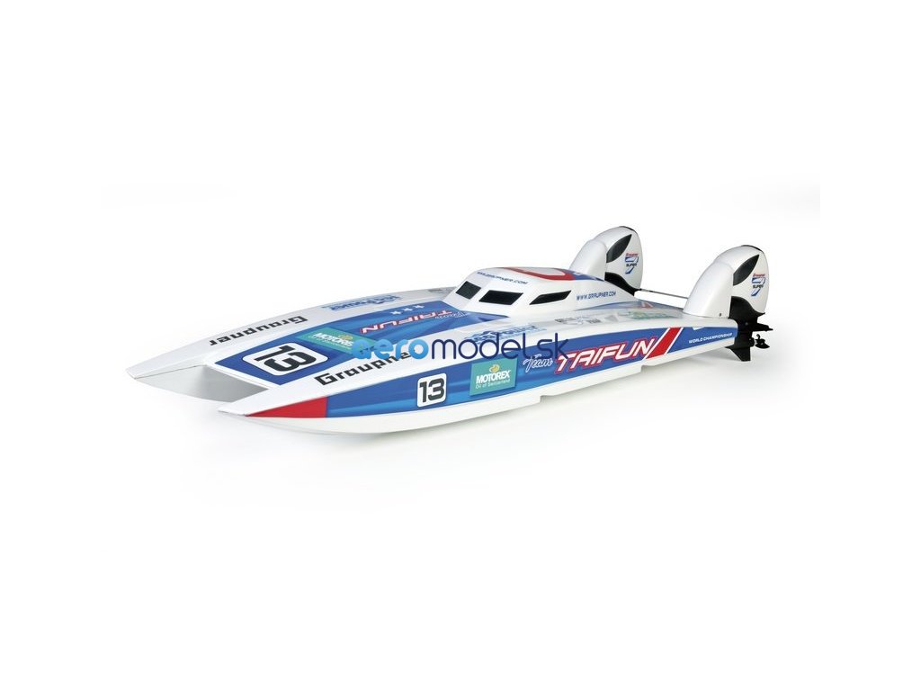 Nová závodní kočka s názvem Typhoon je čistokrevným závodním katamaránem se dvěma přívěsnými speciálními třídami. Motory Graupner Inline Brushless Motors ji urychlují na maximální rychlost vyšší než 70 km / h. Jako zdroj napájení je k dispozici 2x 3S Lipo.