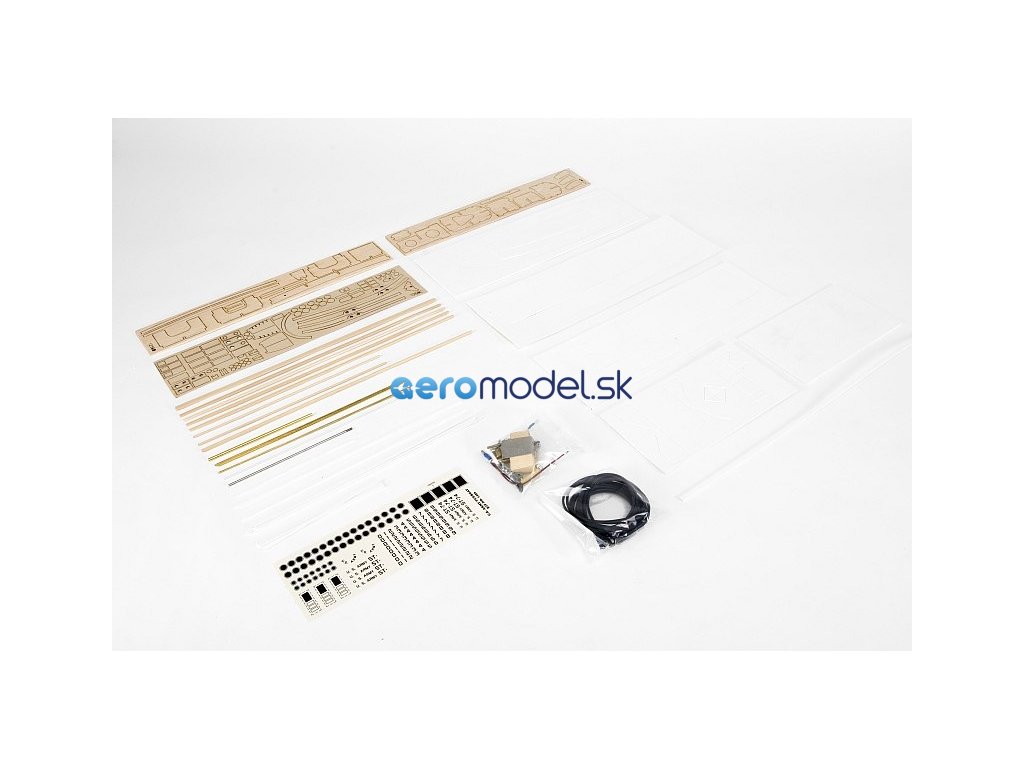Stavebnice obsahuje: vakuové výlisky trupu, laserem vyřezávané balsové a překližkové díly, desk z mikropěnového PVC s předseknutými díly, smrkové a plastové nosníky a tyčinky, odlévané kovové díly a další maketové příslušenství, lodní hřídel s pouzdrem, dvoulistý lodní šroub 25 mm, sadu samolepek, výkres lodi v měřítku 1:1, obrázkový návod ke stavbě.