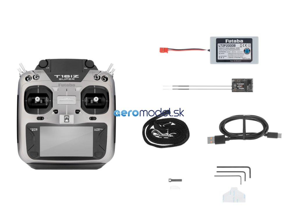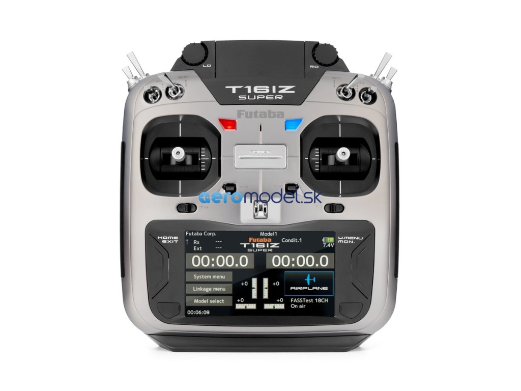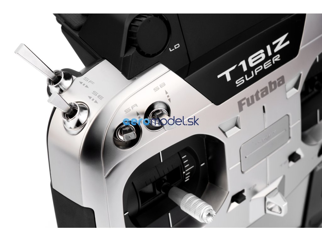 Vysílač T16IZ SUPER ve skříňce dokonale padnoucí do ruky je vybaven přesnými křížovými ovladači s nastavitelnou aretací/neutralizací, 8 přepínači, 2 posuvnými ovladači, 4 digitálními trimy a 2 otočnými proporcionálními ovladači. K programování slouží dvojice tlačítek a velký podsvícený barevný dotykový LCD displej zajišťující snadnou orientaci v intuitivním menu. T16IZ SUPER má paměť pro 30 modelů neomezeně rozšiřitelnou pomocí mikroSD karty a širokou škálu pokročilých mixových funkcí pro akrobatická letadla, větroně, vrtulníky a multikoptéry. Kromě zobrazení telemetrických dat na displeji je k dispozici hlasový výstup telemetrie v zásuvce pro sluchátko (není součástí soupravy). T16IZ SUPER je rovněž vybaven zásuvkou učitel-žák a zásuvkou pro programování a nastavování S.BUS serv a gyroskopických systémů CGY755/CGY760R nebo GYA553. USB datová zásuvka na horní straně vysílače možňuje používat T16IZ SUPER po připojení k PC USB kabelem jako ovladač pro RC simulátor bez potřeby dodatečného USB rozhraní.