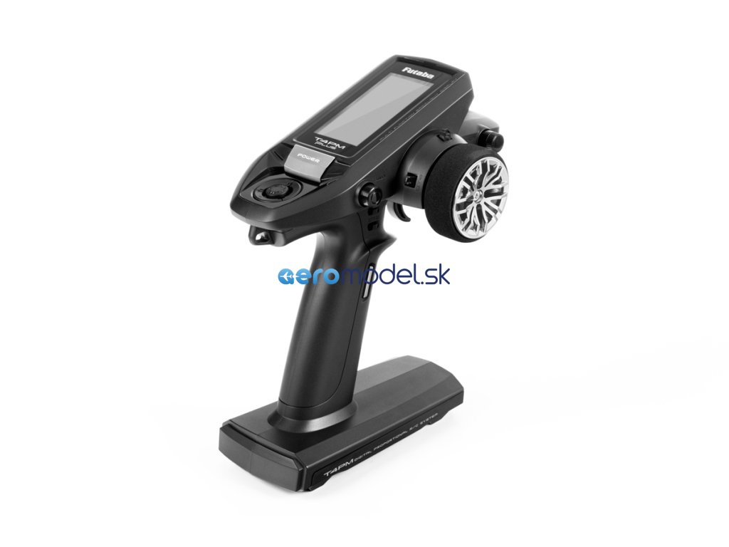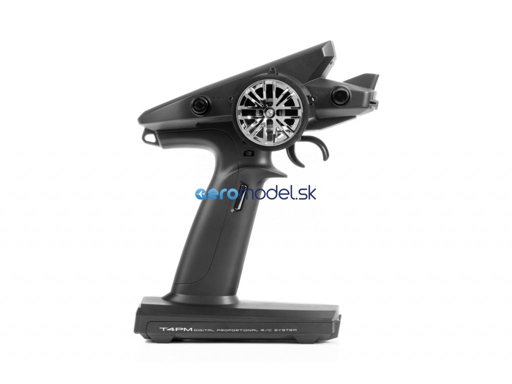 Vysílač T4PM plus v klasickém volantovém designu s rukojetí dokonale padnoucí do ruky je vybaven volantovým ovladačem řízení, spouští pro ovládání plynu, dvěma tlačítkovými přepínači, jedním otočným ovladačem a pěti digitálními trimy (3 okolo volantu, 2 na rukojeti). K programování slouží trojice tlačítek a multifunkční joystick; snadnou orientaci v intuitivním menu zajišťuje velký podsvícený LCD displej. T4PM má paměť pro 40 modelů a širokou škálu pokročilých programových funkcí pro běžné i speciální modely aut - např. nezávislé řízení a pohon (se 2 regulátory) předních i zadních kol pro crawlery, dvojokruhové brzdy pro velké modely 1:5, gyro pro drifting, ABS, kontrola trakce, mix pro tanky apod.