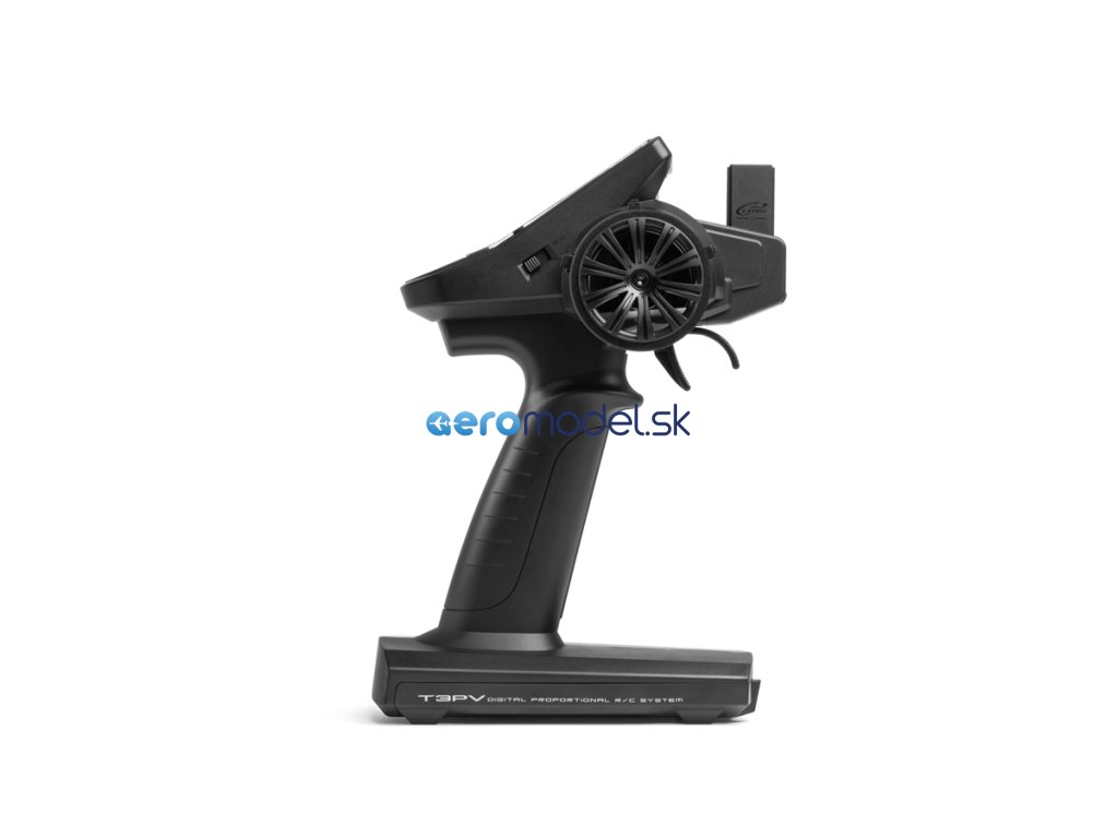 Vysílač T3PV v klasickém volantovém designu s rukojetí dokonale padnoucí do ruky je vybaven volantovým ovladačem řízení, spouští pro ovládání plynu, posuvným přepínačem pro třetí kanál a třemi digitálními trimy okolo volantu (DT3 může sloužit k proporcionálnímu ovládání 3. kanálu). K programování slouží čtveřice tlačítek; snadnou orientaci v intuitivním menu zajišťuje velký LCD displej. T3PV má paměť pro 10 modelů a širokou škálu programových funkcí pro běžné i speciální modely aut (např. řízená přední i zadní kola pro crawlery, dvouokruhové brzdy pro velké modely 1:5 apod.).