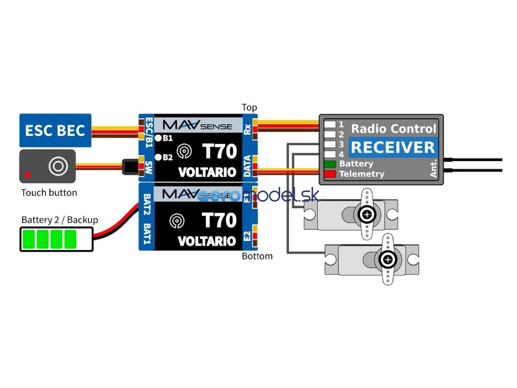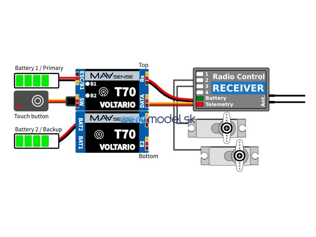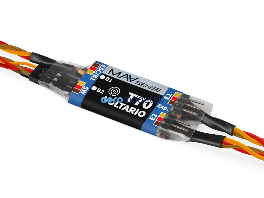 Voltario T70 představuje výkonný digitální systém pro zálohu napájení, jenž nabízí i pokročilé telemetrické funkce. Obsahuje nabíjecí obvod a funkci dotykového vypínače. Zařízení je ideální pro středně velké modely, kde se používají např. HV serva napřímo bez stabilizace napětí.Voltario T70 je vhodné pro modely vybavené buď dvěma přijímačovými bateriemi, případně regulátorem se stabilizací napětí (BEC) v kombinaci s malou záložní baterií. Zařízení preferuje svůj primární bateriový vstup (až 3S LiPo), přičemž v případě poklesu napětí se automaticky přepne na sekundární vstup. Nabíjecí obvod může být volitelně aktivován pro nabíjení záložní baterie z primárního vstupu/obvodu BEC.