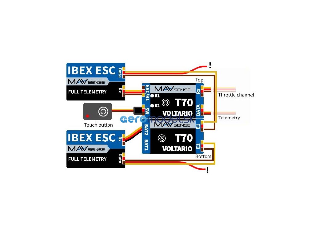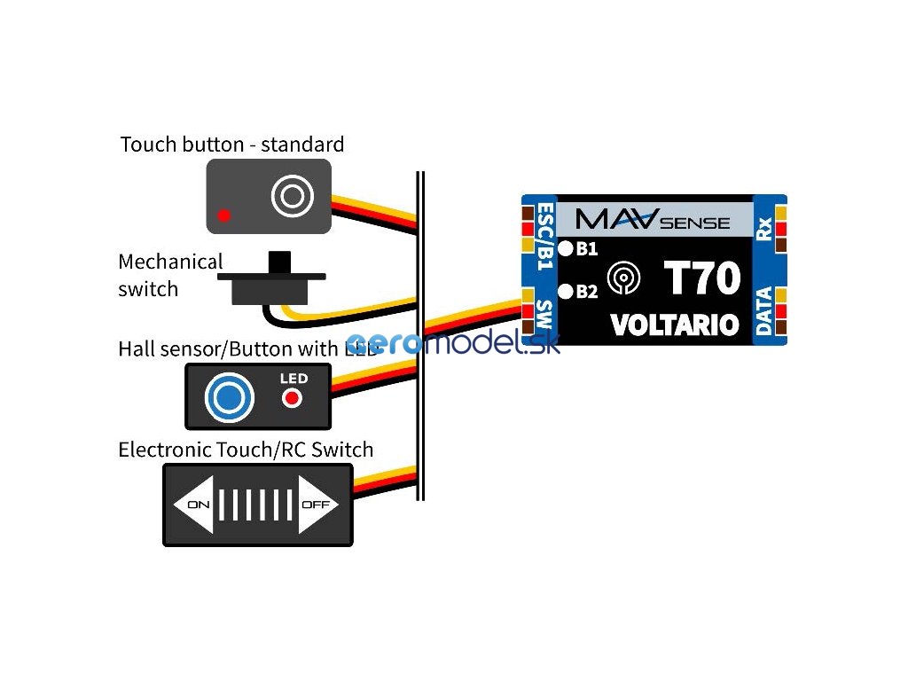 Voltario T70 je určeno k zapínání/vypínání elektroniky ve vašem modelu, přičemž jím můžete kompletně nahradit mechanický vypínač. Zařízení si pamatuje svůj poslední provozní stav, a jestliže dojde k náhodnému odpojení baterie, Voltario se po opětovném zapojení baterie automaticky znovu spustí a sepne.