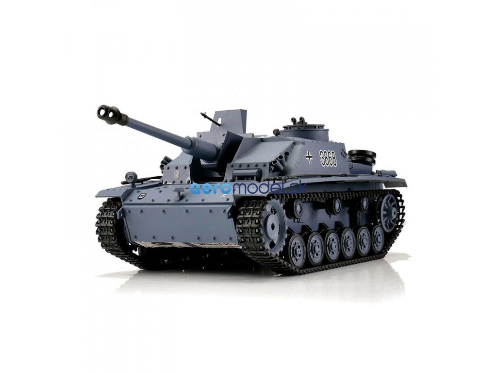 S hmotností kolem tří kilogramů je Sturmgeschütz III ideální pro začínající tankisty. V technologií desek plošných spojů 2,4 GHz a reproduktorem. Tento model má vynikající jízdní vlastnosti, realistický zvuk, mnoho malých dílů a různých samolepek dokonale završuje repliku modelu.