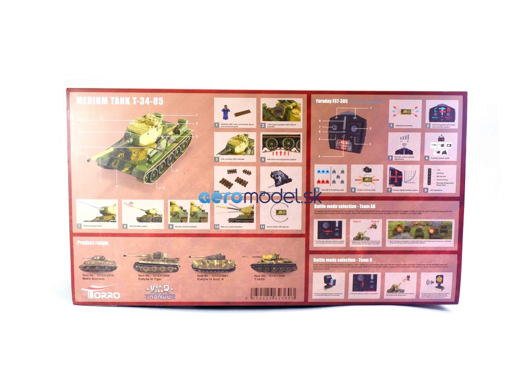 RC model sovietskeho tanku T-34/85 z 2 svetovej vojny. Model je v mierke 1:24 a detailne kopíruje svoju historickú predlohu. Je schopný jazdy do všetkých smerov, otáčanie veže do strán o 180 ° a meniť sklon o 25 °. Do modelu je tiež zabudovaný zvukový modul, ktorý simuluje streľbu delá, guľometu, a tiež zvuk motora či otáčanie veže. Tank má proporcionálne plynulé ovládanie pre realistické pohyby. Prevádzka tanku, zabezpečuje 6 AA batérií, u ovládača je to 4xAA a u terče sú to 2xAAA batérie (nie sú súčasťou balenia).