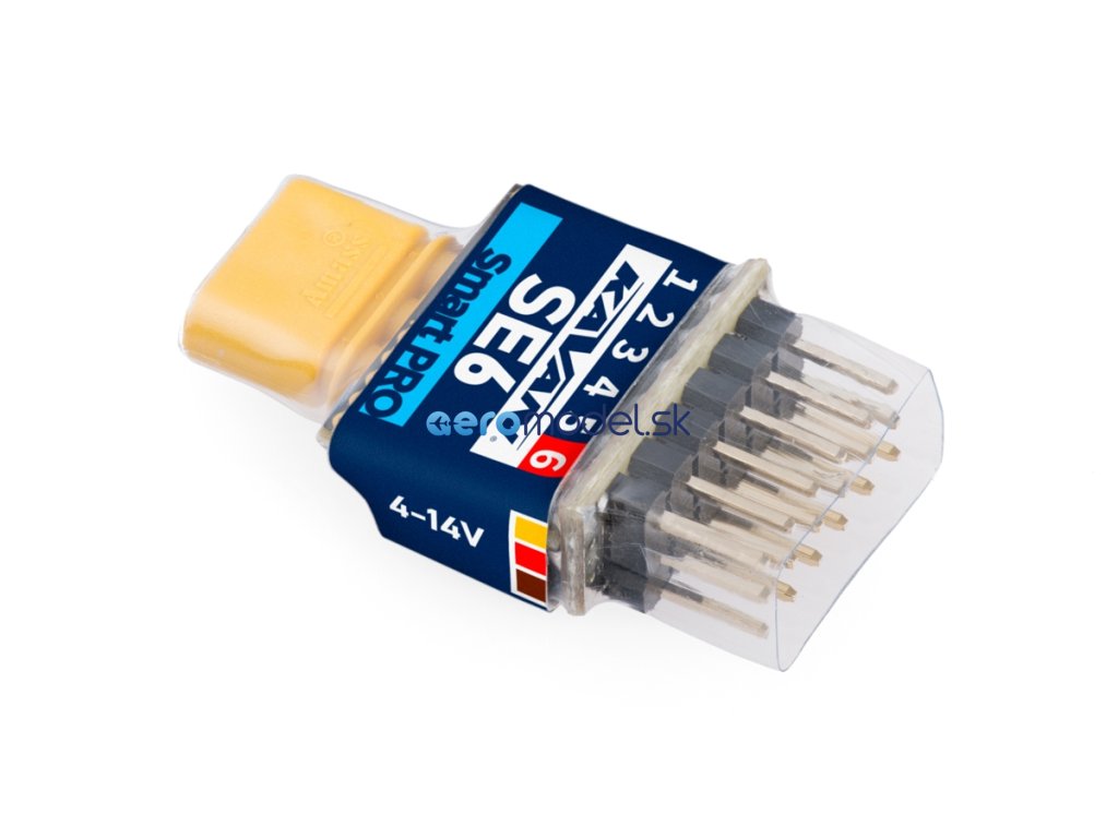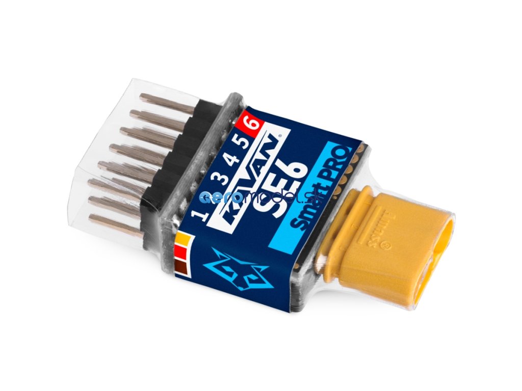 KAVAN Smart PRO SE6M je dekodér/expandér, které převádí vstupní signál sériové sběrnice na standardní servo výstupy (PWM). Nabízí až šest konfigurovatelných výstupů pro serva s volitelnou periodou a nastavením fail-safe. SE6M je perfektní volbou pro modely se složitou mechanikou křídel nebo ocasních ploch, kde je možné k primárnímu přijímači připojit více serv pomocí jediného kabelu. Pokud vám docházejí kanály na přijímači, jednoduše připojte SE6M k sériové lince z přijímače a libovolně přiřaďte své vlastní výstupní kanály.