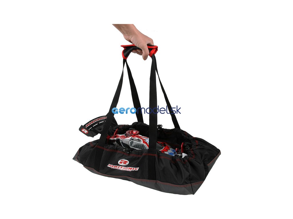 Robitronic taška pro auta Buggy 1:8 má rozměry 33 cm x 57 cm x 15 cm, na konci lemu je stahovací šňůra. Délka ucha je cca 30 cm. Pevná prošitá textilie s pevnými uchy. Uložte model po jízdě do tašky a udržte sedadla, či zavazadlový prostor čistý a suchý.