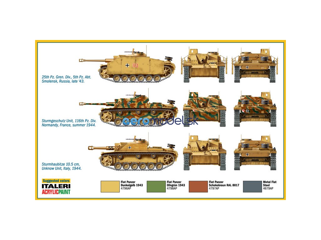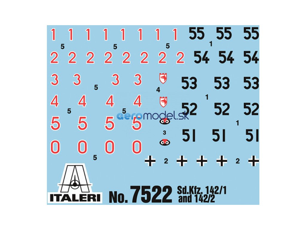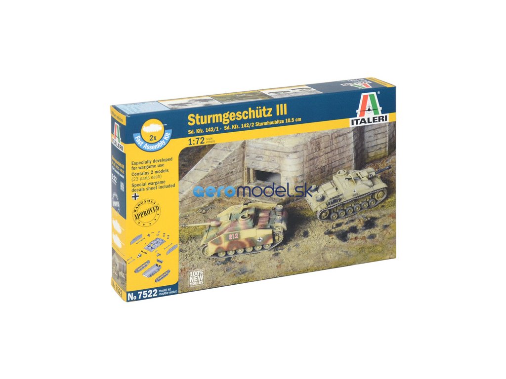 Italeri 7522 - Easy Kit tank STURMGESCHUTZ III v mierke 1:72. Dĺžka modelu 76 mm, obtiažnosť 1. Balenie obsahuje DVA RÝCHLO ZOSTAVITEĽNÉ MODELY a ŠPECIÁLNE POTLAČE PRE 3 VERZIE.