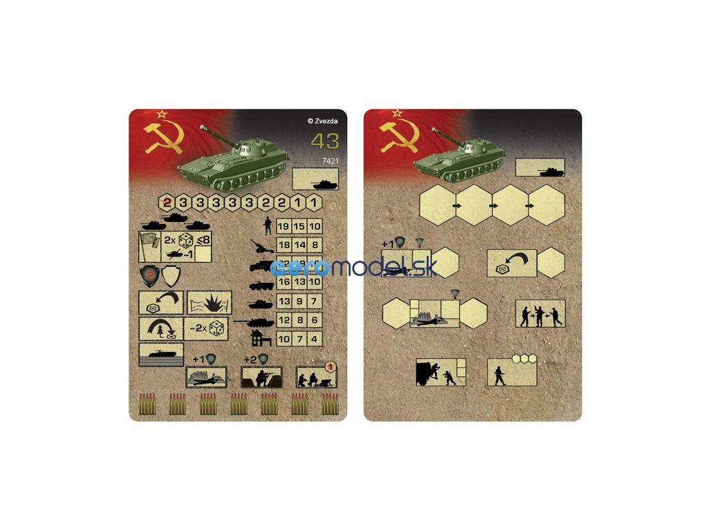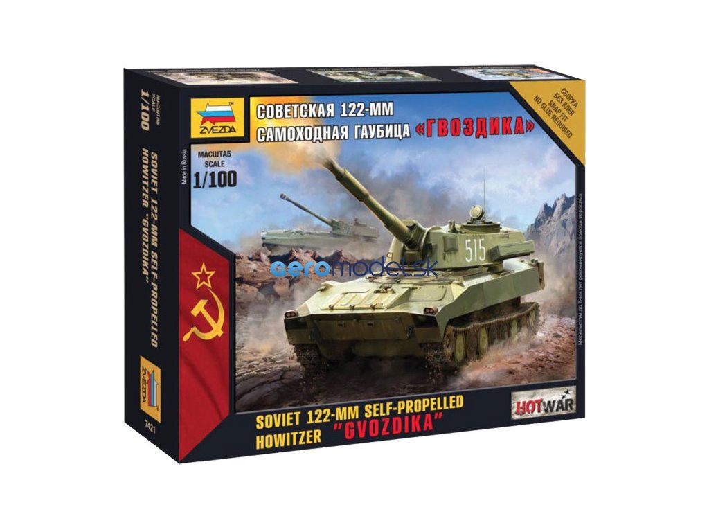 Plastikový model Zvezda 7421 - samohybná húfnica 2S1 Gvozdika 122 mm v mierke 1:100. Stavebnica obsahuje 19 dielov, dĺžka 74 mm, obtiažnosť 2.