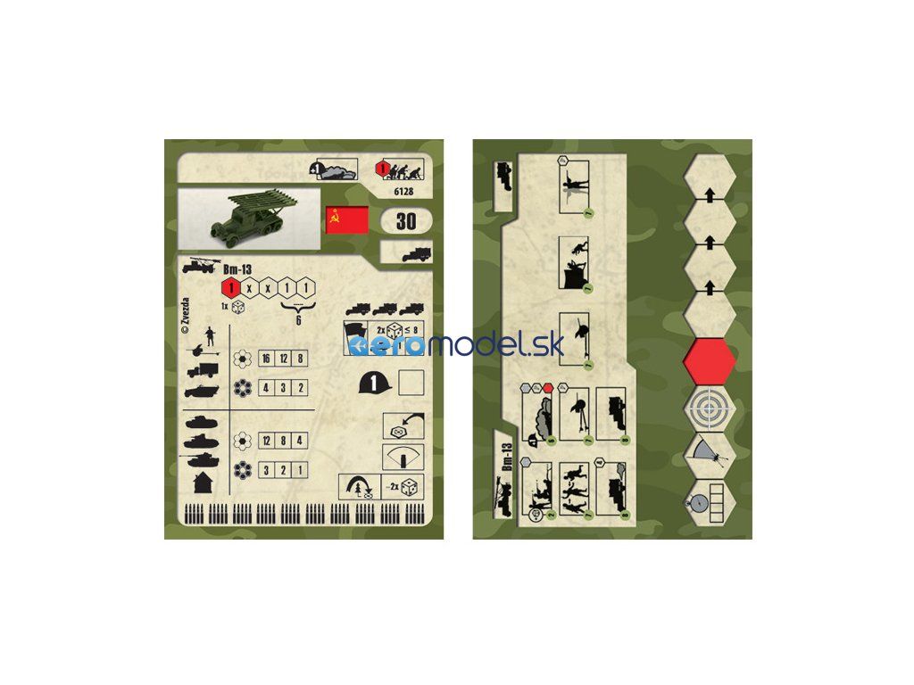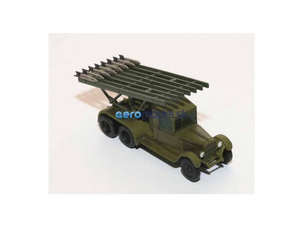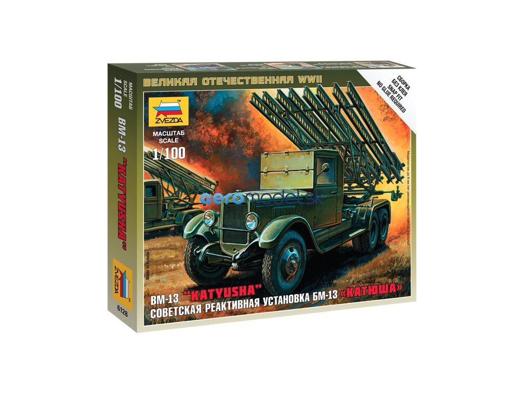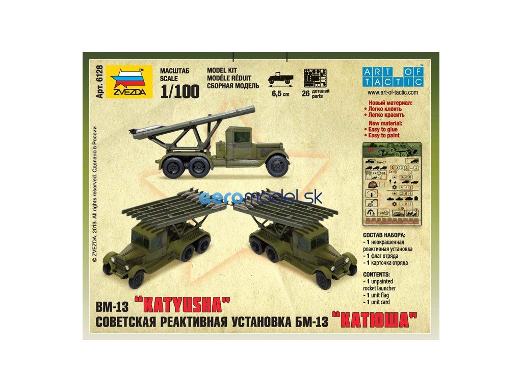 Plastikový model Zvezda 6128 - vojenská BM-13 Kaťuša v mierke 1:100. Stavebnica obsahuje 26 dielov, dĺžka 65 mm, obtiažnosť 2.
