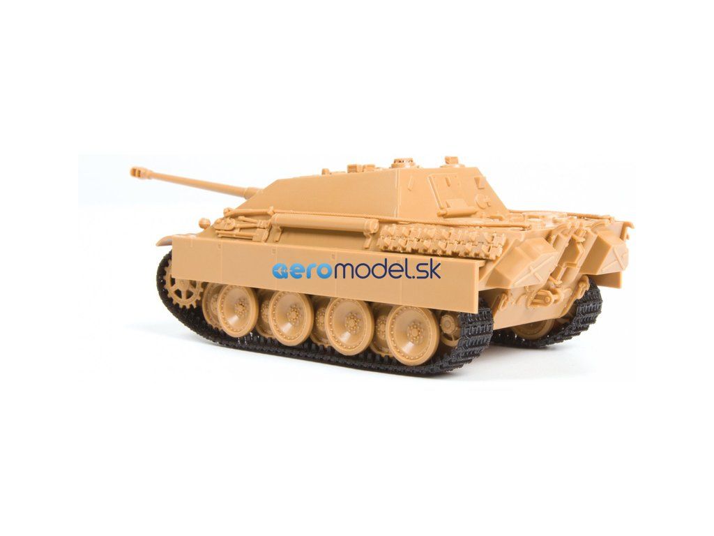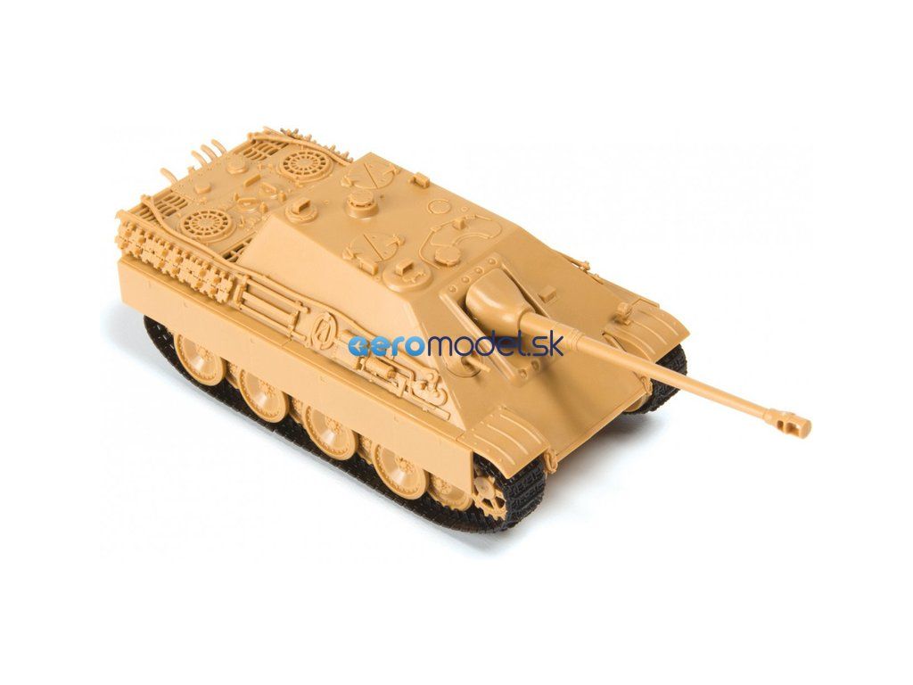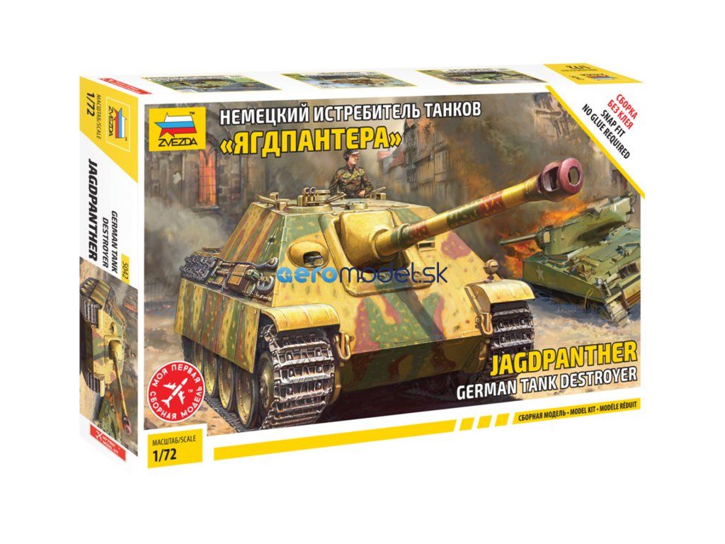 Plastikový model Zvezda 5042 - nemecký stíhač tankov Jagdpanther (Sd. Kfz. 173) z 2. svetovej vojny v mierke 1:72. Sada obsahuje 97 dielikov, dĺžka 133 mm, obtiažnosť 3.