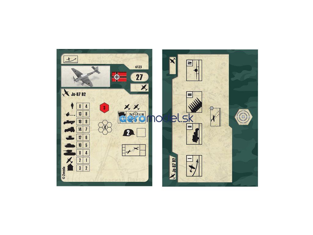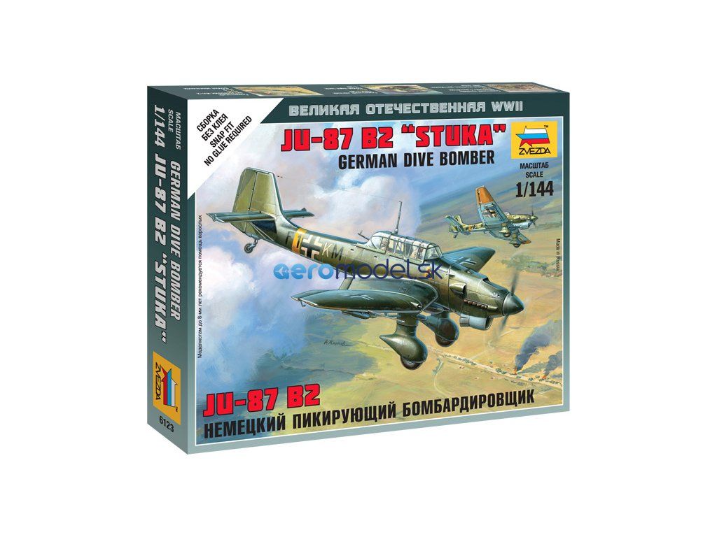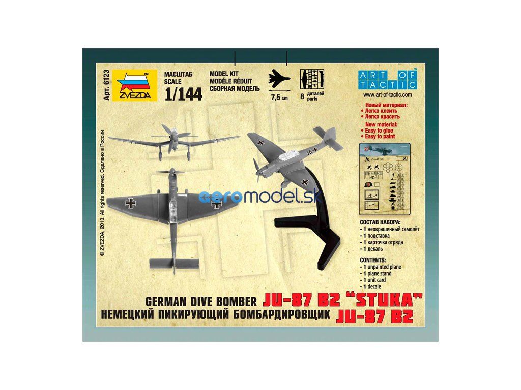 Plastikový model Zvezda 6123 - Junkers Ju-87 Stuka v mierke 1:144. Sada obsahuje 8 dielov, dĺžka 75 mm, obtiažnosť 1.