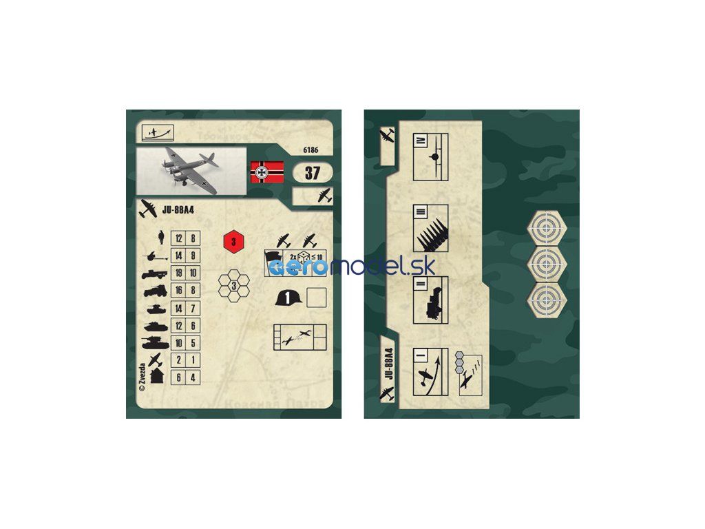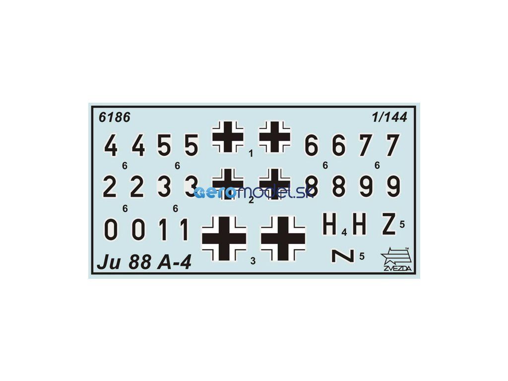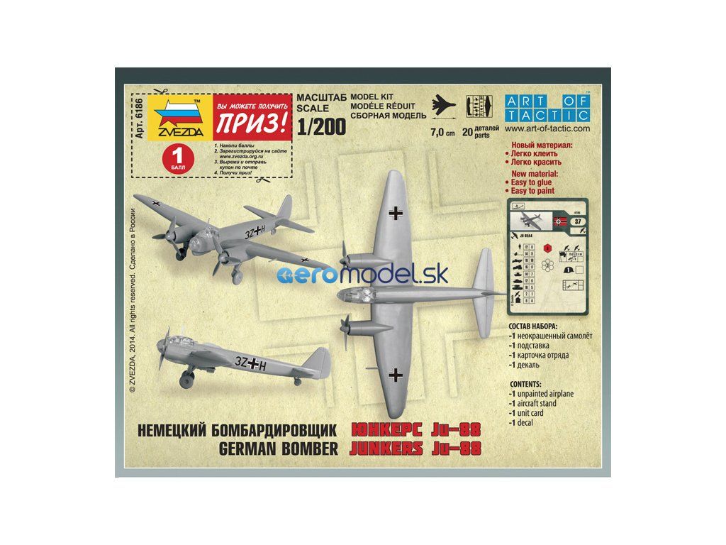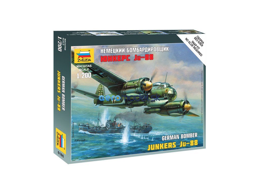 Plastikový model Zvezda 6186 - nemecké viacúčelové lietadlo Junkers Ju-88A4 v mierke 1:200. Sada obsahuje 20 dielov, dĺžka 70 mm, obtiažnosť 1.