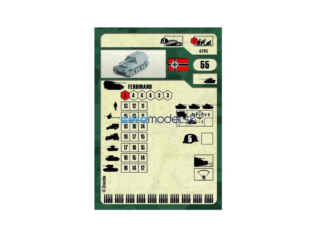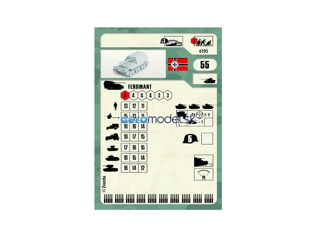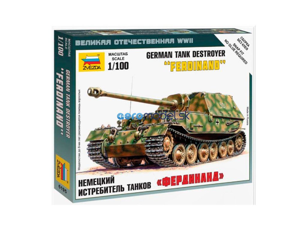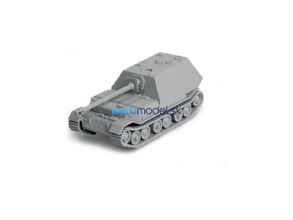 Plastikový model Zvezda 6191 - nemecký ťažký stíhací tank SdKfz 184 "Ferdinand" v mierke 1:100. Sada obsahuje 11 dielov, dĺžka 81 mm, obtiažnosť 4.