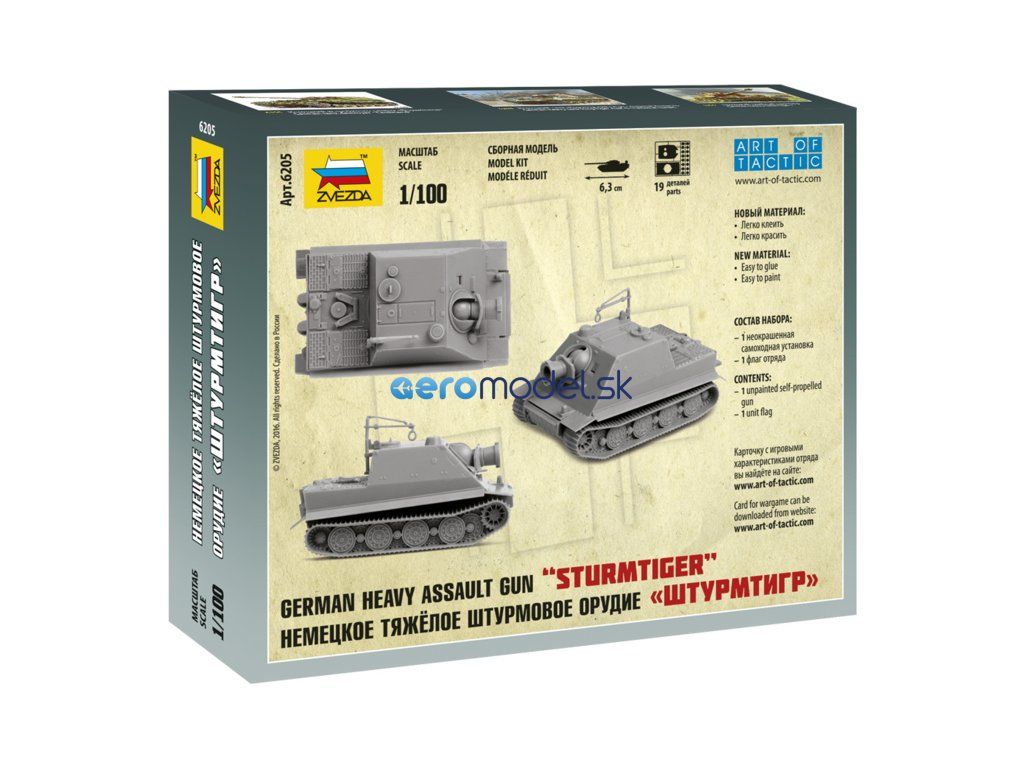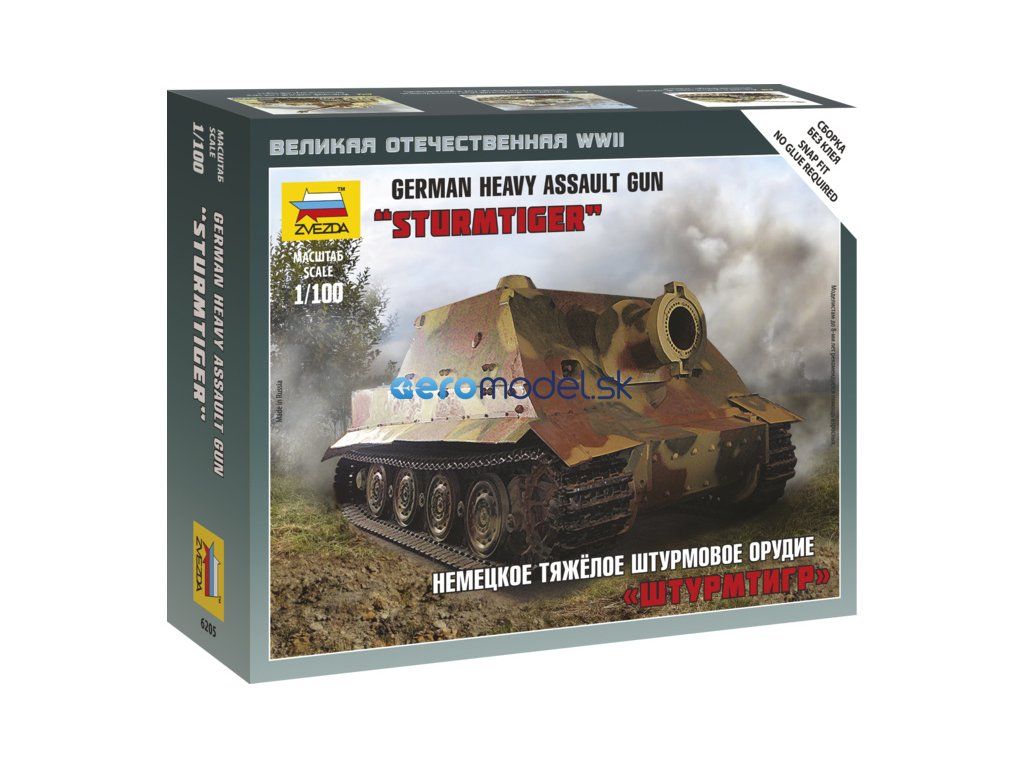 Plastikový model Zvezda 6205 - nemecké útočné vozidlo Sturmtiger v mierke 1:100. Stavebnica obsahuje 19 dielov, dĺžka 63 mm, obtiažnosť 3.
