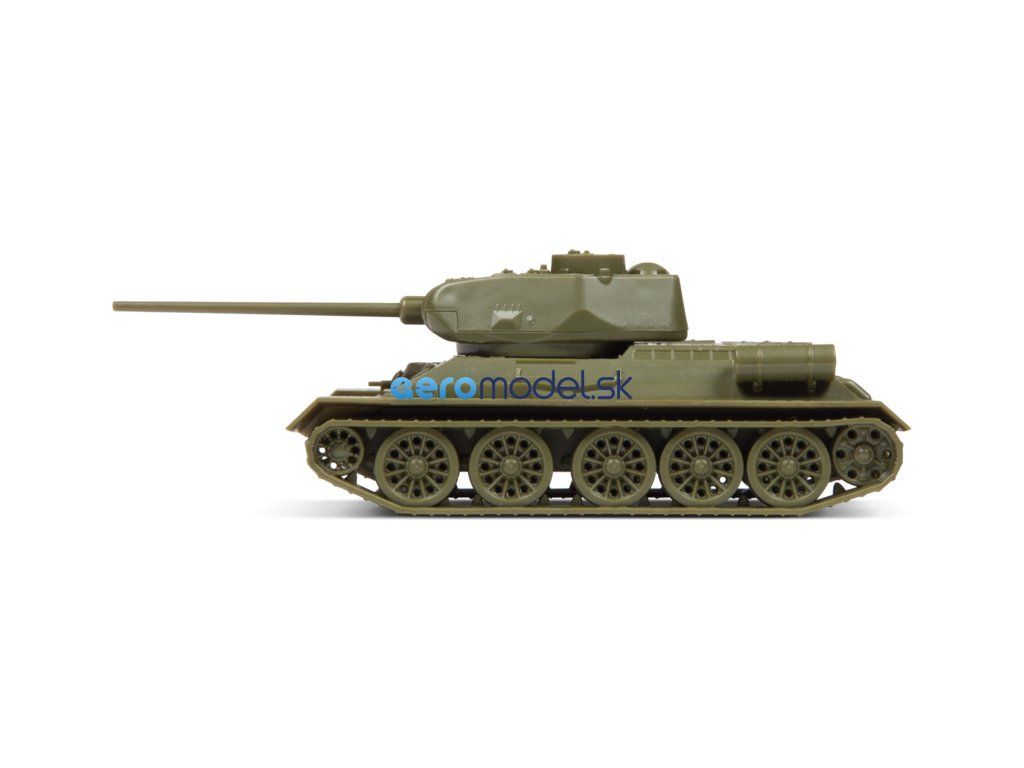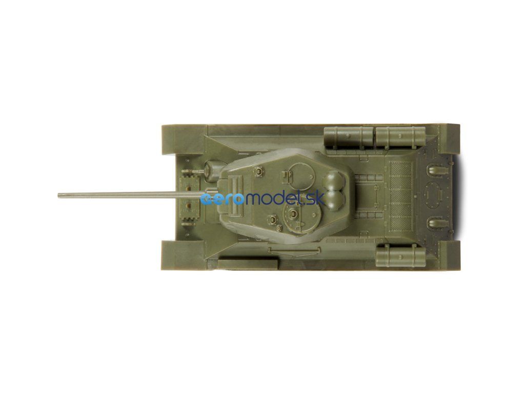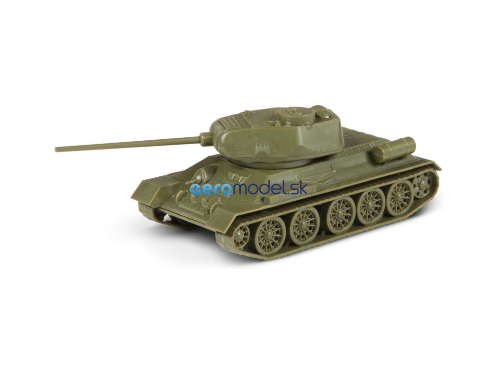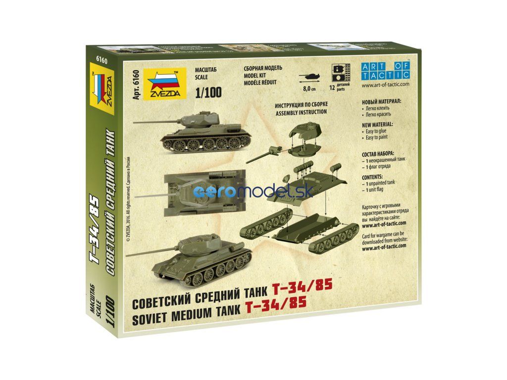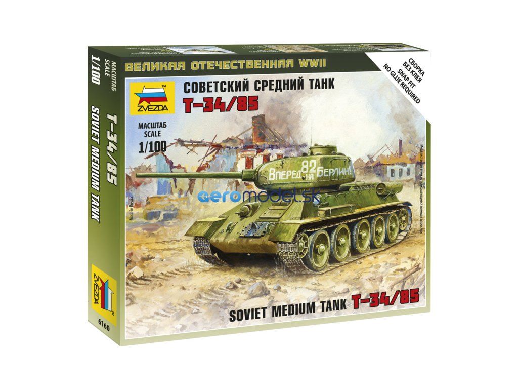 Plastikový model Zvezda 6160 - sovietsky tank T-34/85 v mierke 1:100. Sada obsahuje 12 dielov, dĺžka 80 mm, obtiažnosť 4.