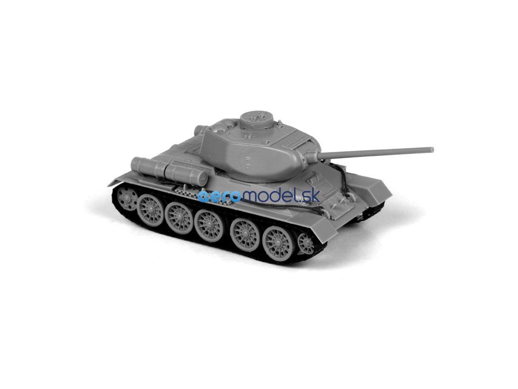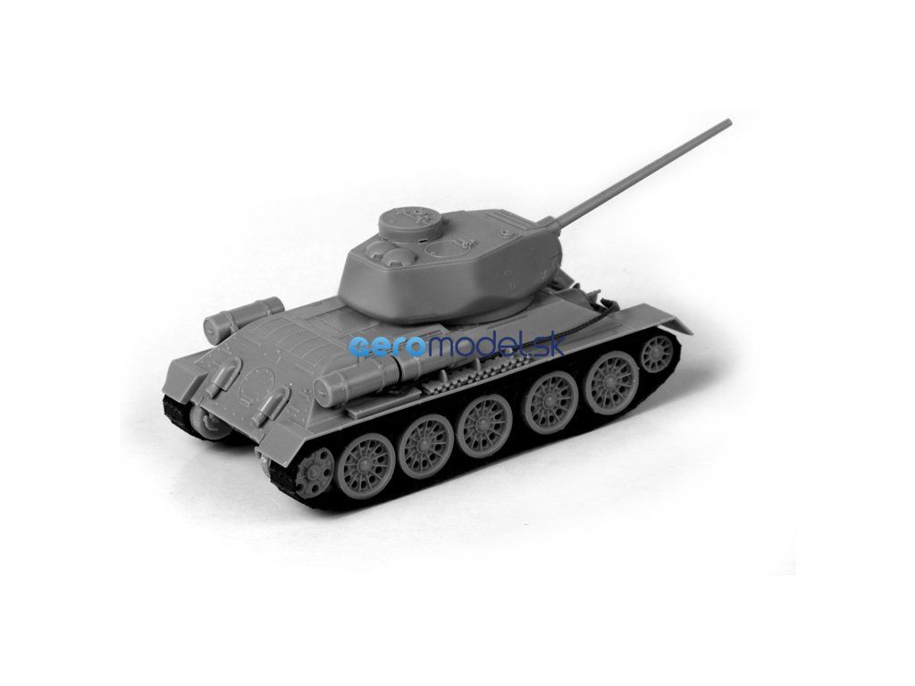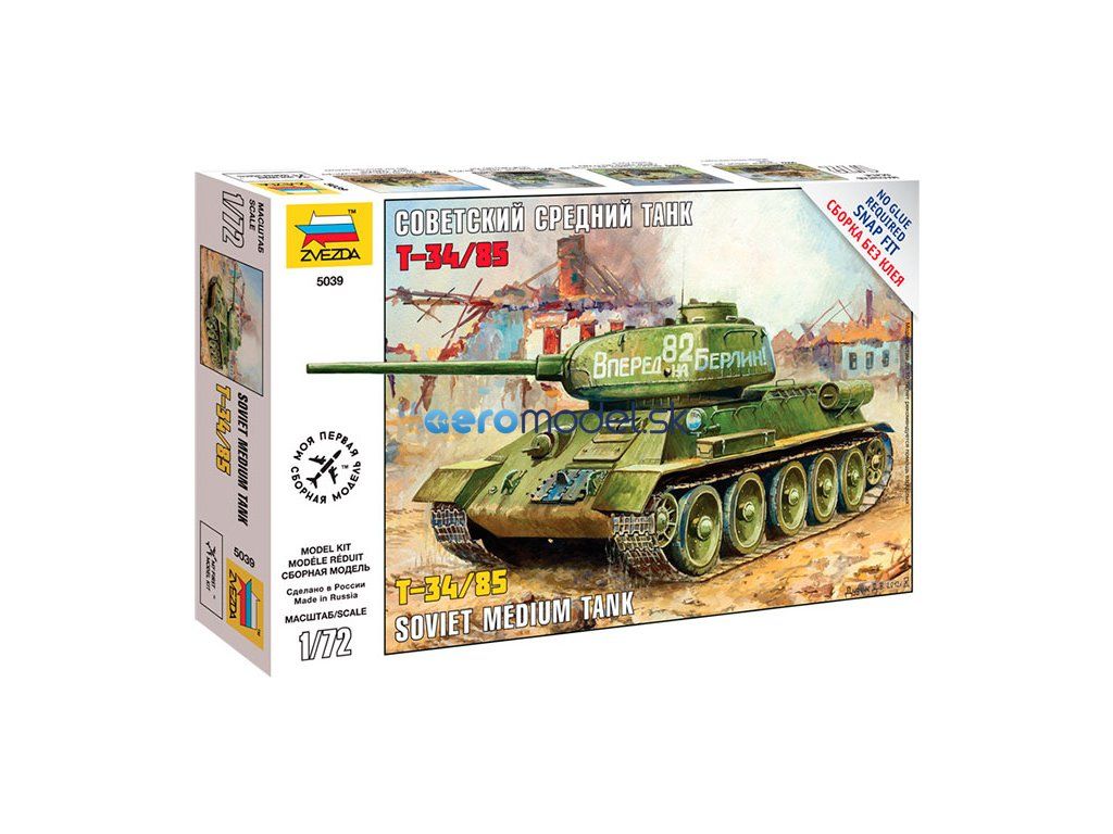 Plastikový model Zvezda 5039 - tank T-34/85 v mierke 1:72. Sada obsahuje 60 dielov, dĺžka 112 mm, obtiažnosť 3.