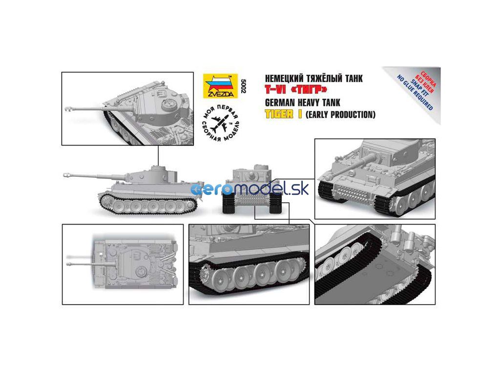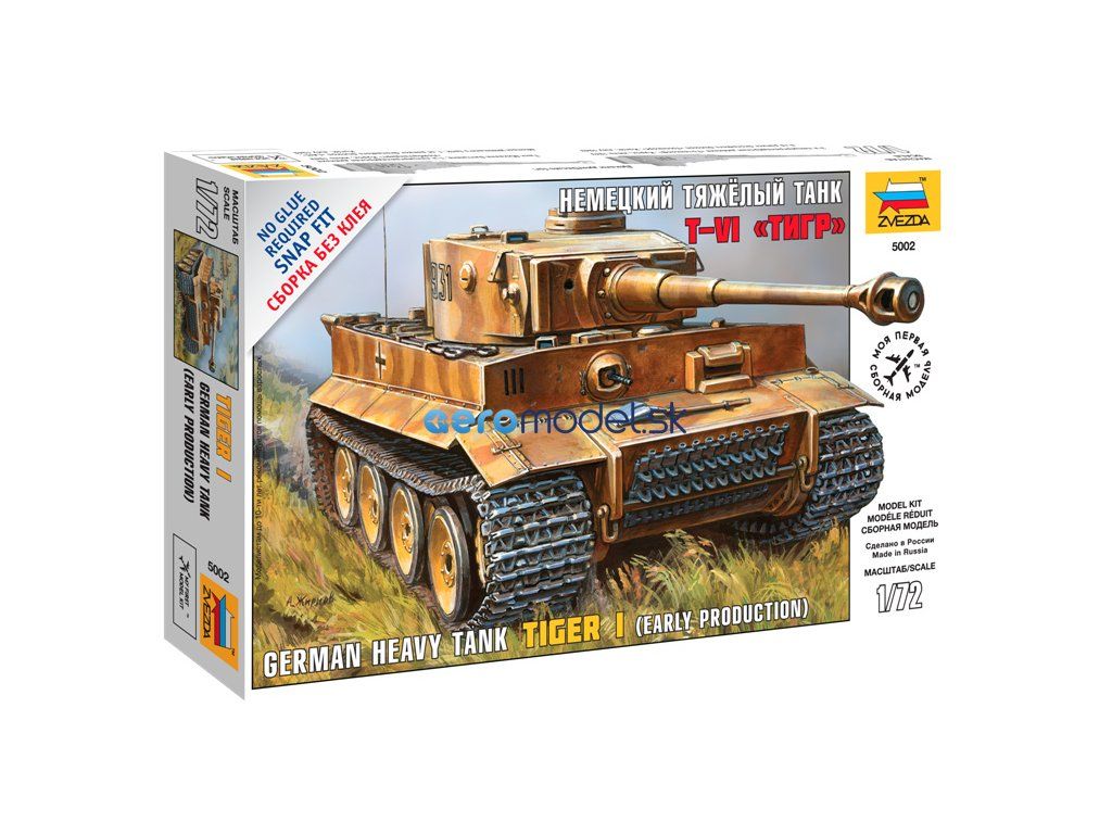 Plastikový model Zvezda 5002 - nemecký ťažký tank Tiger I v mierke 1:72. Sada obsahuje 63 dielikov, dĺžka 125 mm, obtiažnosť 3.