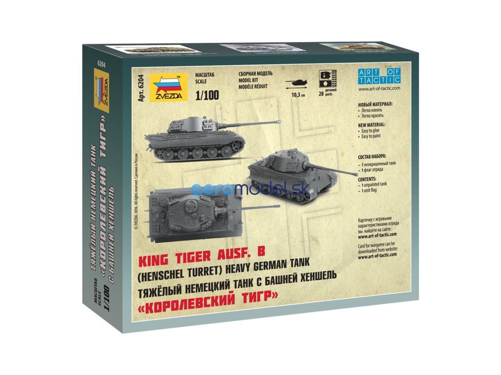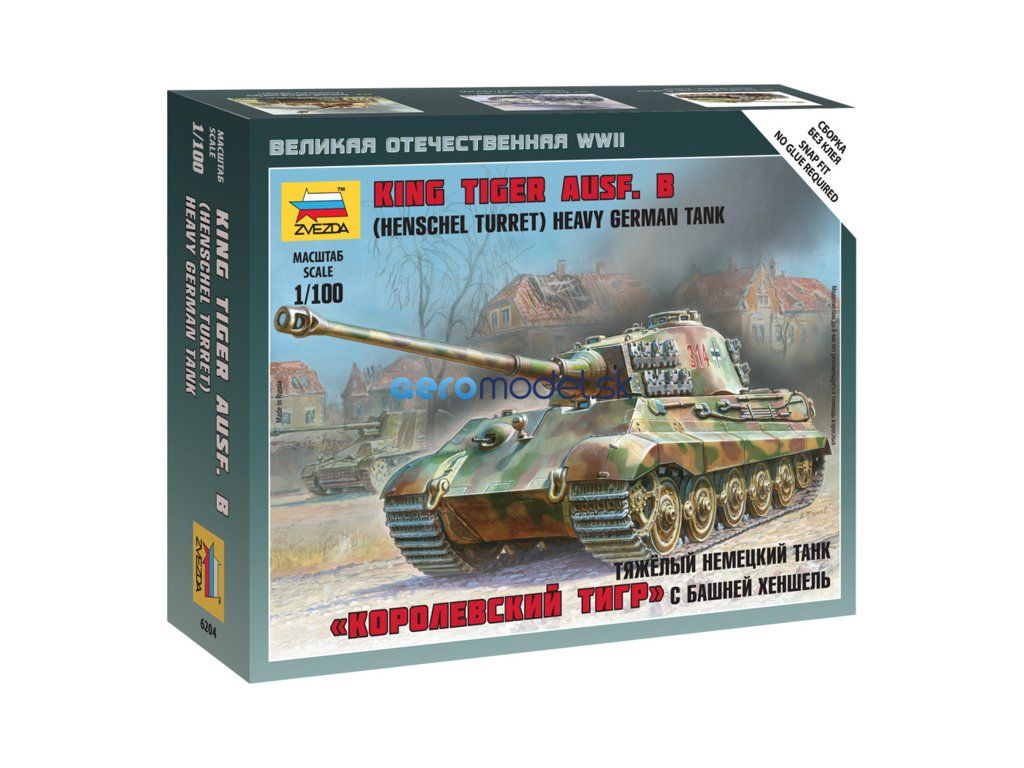Plastikový model Zvezda 6204 - nemecký ťažký tank King Tiger Ausf. B v mierke 1:100. Sada obsahuje 28 dielikov, dĺžka 103 mm, obtiažnosť 4.