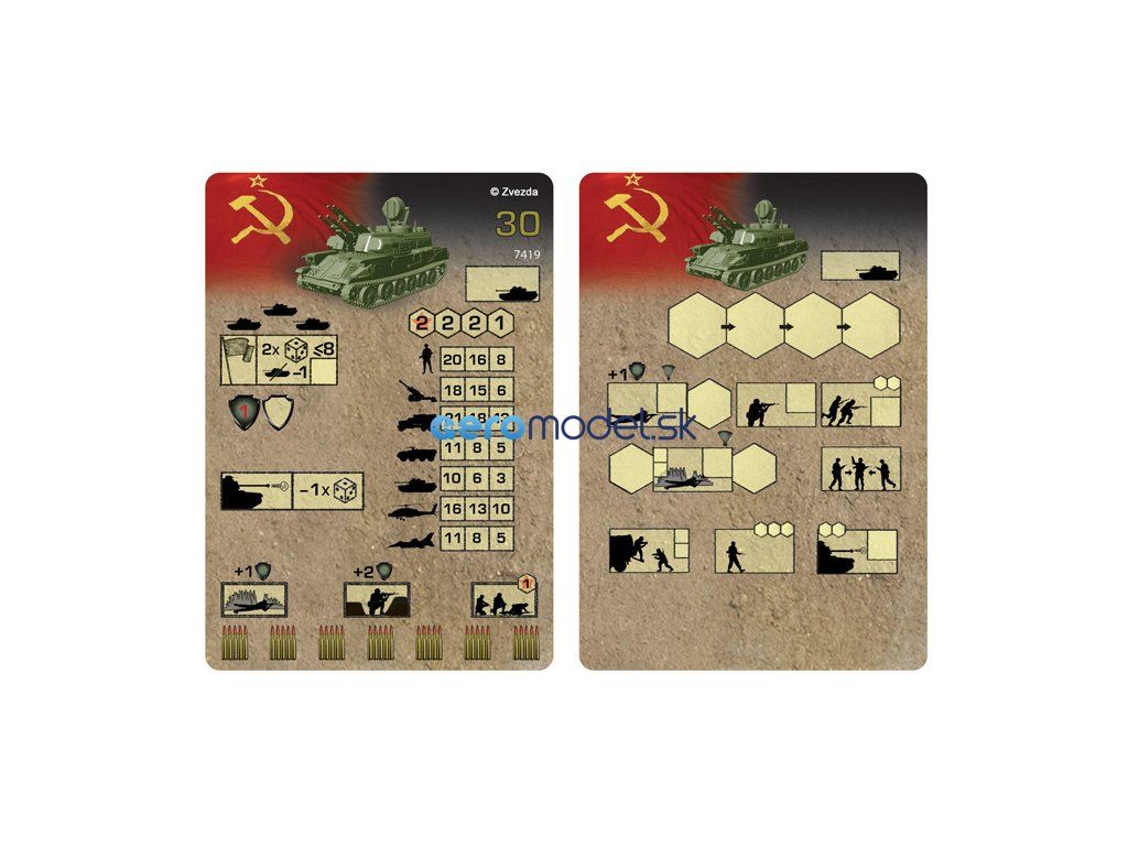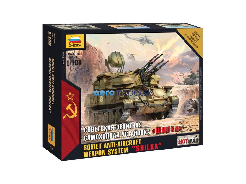 Plastikový model Zvezda 7419 - samohybný protilietadlový tank ZSU-23-4 Shilka v mierke 1:100. Stavebnica obsahuje 29 dielov, dĺžka 67 mm, obtiažnosť 2.
