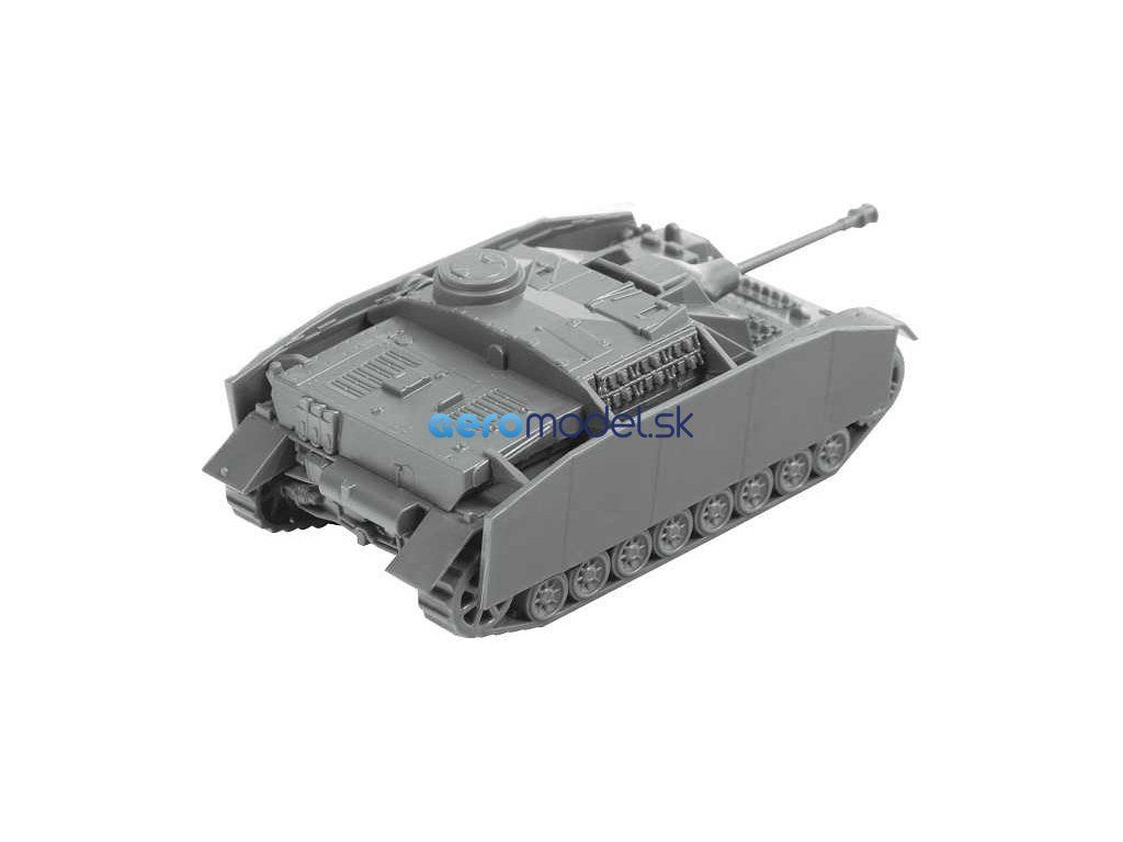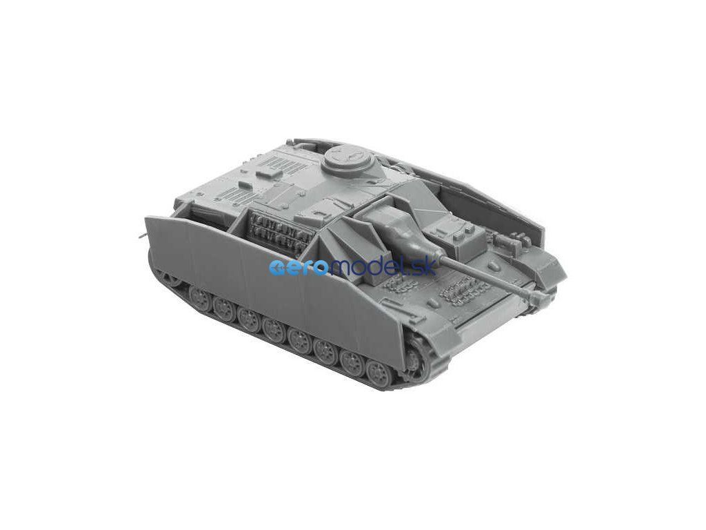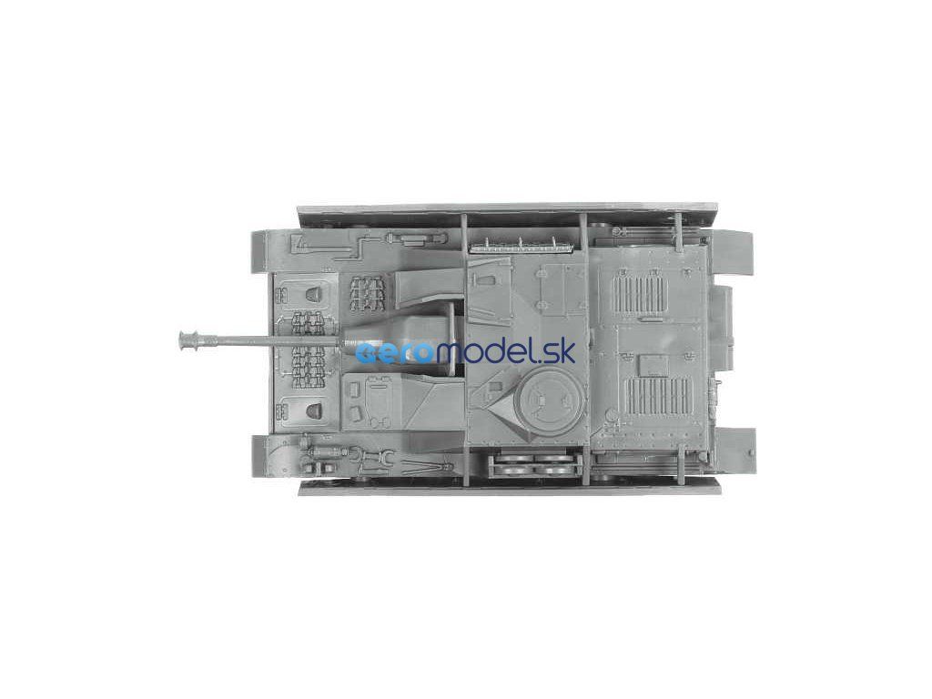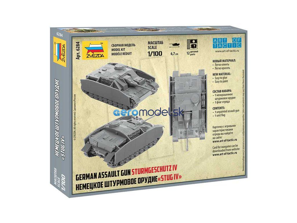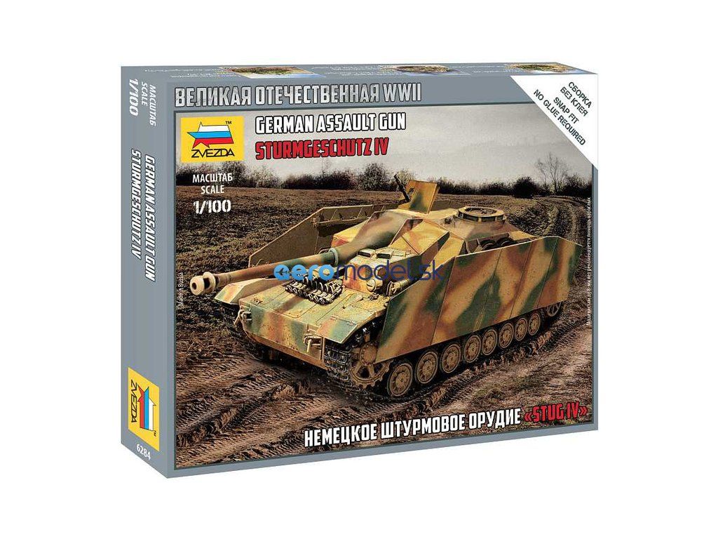Plastikový model Zvezda 6284 - nemecké samohybné delostrelectvo "Stug IV" v mierke 1:100. Sada obsahuje 12 dielov, dĺžka 67 mm.