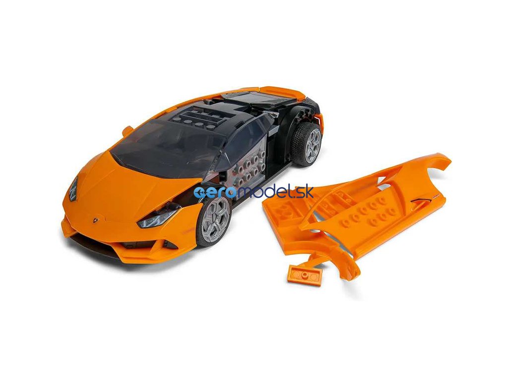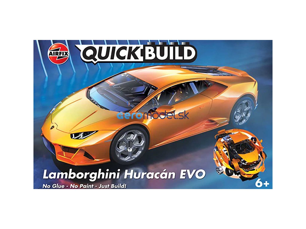 Plastikový model Airfix Quick Build - auto Lamborghini Huracan EVO. Stavebnice obsahuje 45 dílků, obtížnost 1.