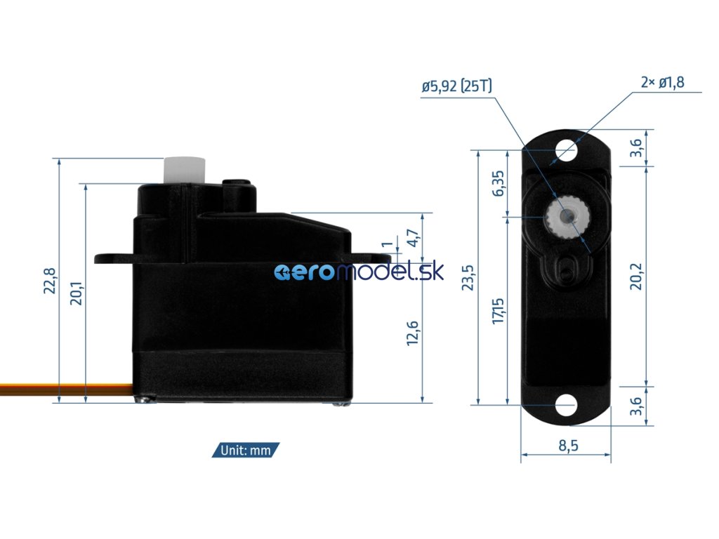 Rychlé digitální pikoservo 3,8 g s plastovými převody pro použití v malých a lehkých RC modelech letadel a vrtulníků, RC autech 1:35, malých člunech apod. Plastová krabička.