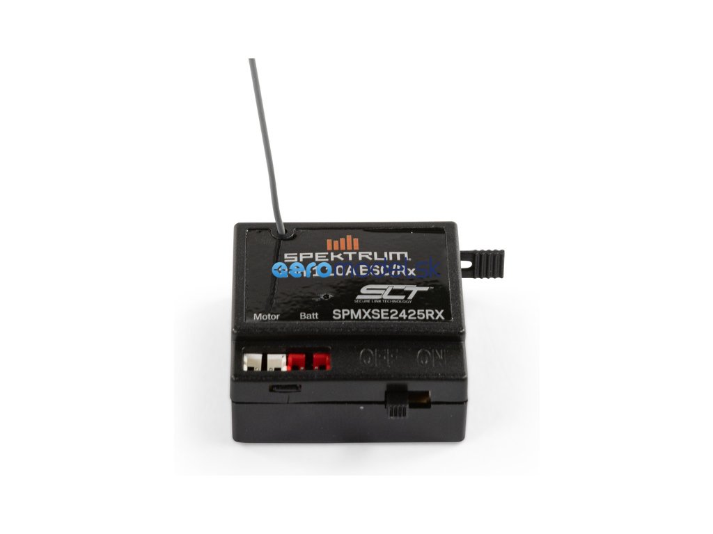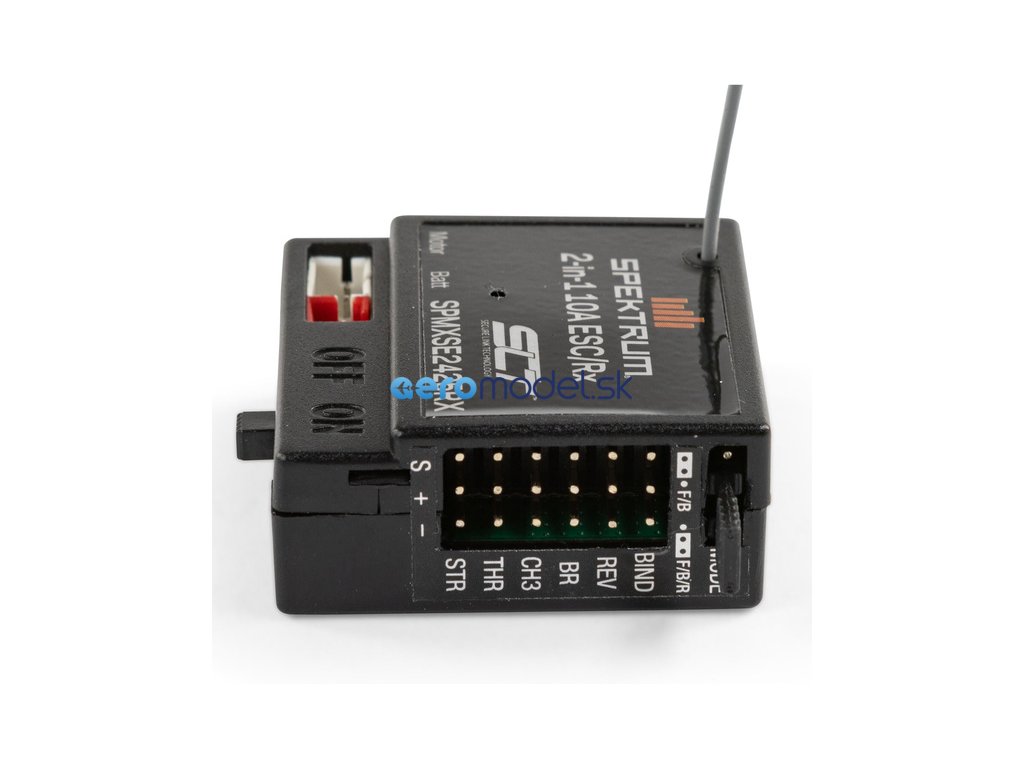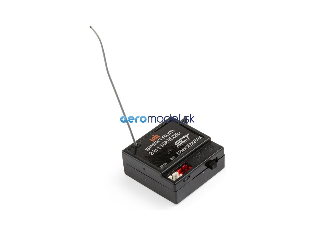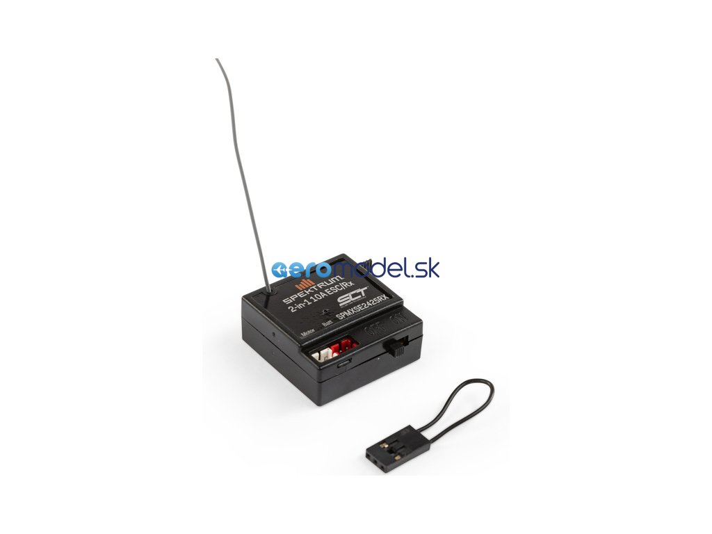 Náhradný diel pre RC modely áut Axial AX24: 3-kanálový regulátor 2v1 Spectrum s integrovaným prijímačom SLT a 10A regulátorom DC. Napájanie 2S LiPo. BEC 5V/1A. Jazdné režimy: jazda vpred/vzad/brzda alebo jazda vpred/vzad. Neutrálna brzda nastaviteľná na 0% (z výroby), 25%, 50%, 75% a 100%. Ochrana proti nedostatočnému vybitiu LiPo batérie pri 6,4 V. LED indikácia stavu jednotky a Fail-Safe. Možnosť pripojiť externý ovládač a používať jednotku len ako prijímač.