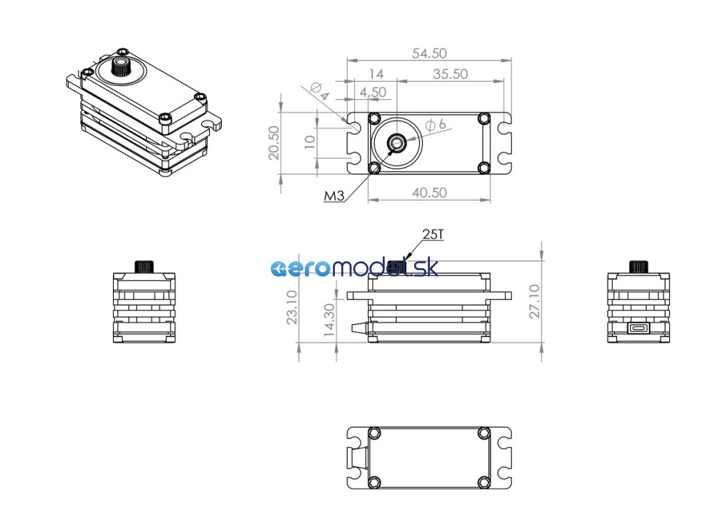 Silné a ultra rychlé úzkopásmové (760µs) digitální nízkoprofilové standardní servo se střídavým motorem, kovovými převody a výstupní hřídelí uloženou na dvou kuličkových ložiscích. Ideální pro vyrovnávací rotory vrtulníků velikosti 550-700, kompatibilní s většinou 760µs gyroskopů a flybarless jednotek. Pro dokonalé chlazení i při velmi vysokém zatížení je servo uloženo v hliníkové krabičce se žebrovanou střední částí. Servo není programovatelné.