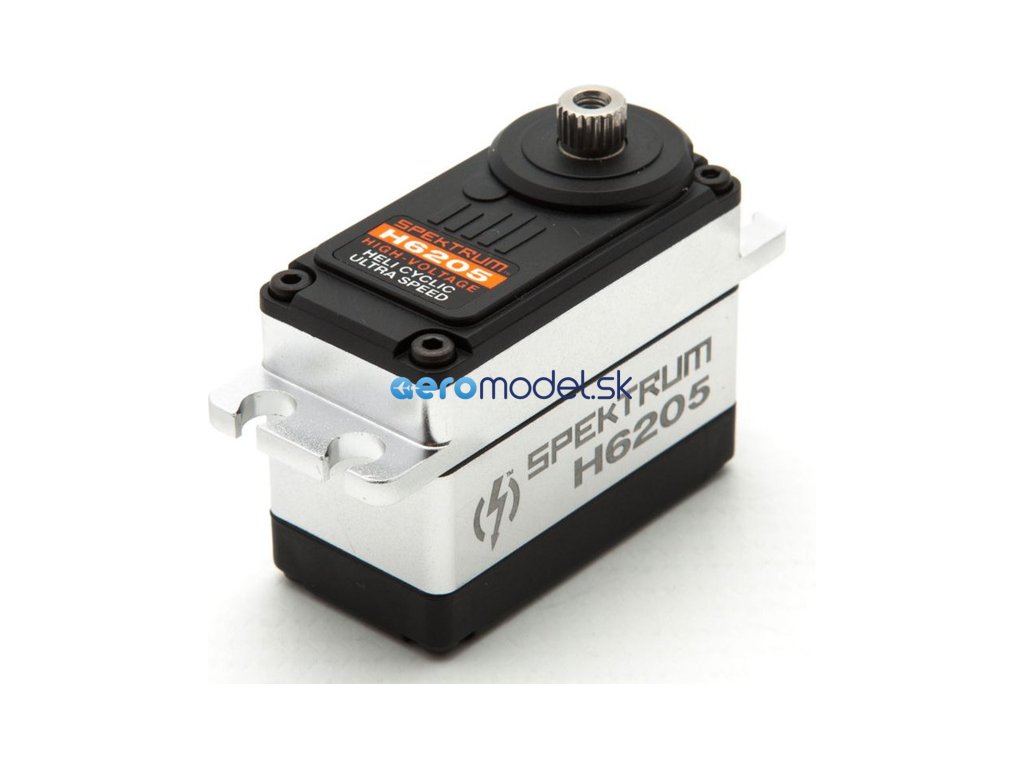Ultra silné, rychlé a odolné digitální Spektrum servo H6205 se coreless stejnosměrným motorem jakožto cyklické servo pro RC vrtulníky velikosti 550 - 700. Kovové převody, kuličková ložiska, hliníkové tělo, napájení 4.8 - 8.4V, moment 12 - 17.1 kg.cm, rychlost 0,07-0,04 s/60°, hmotnost 61.7g, rozměry 40.9x20.9x33.5mm, tisícihran 23T.