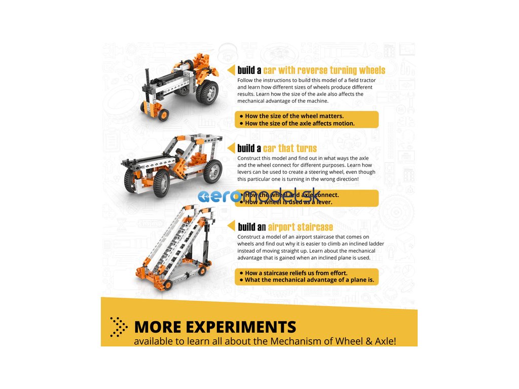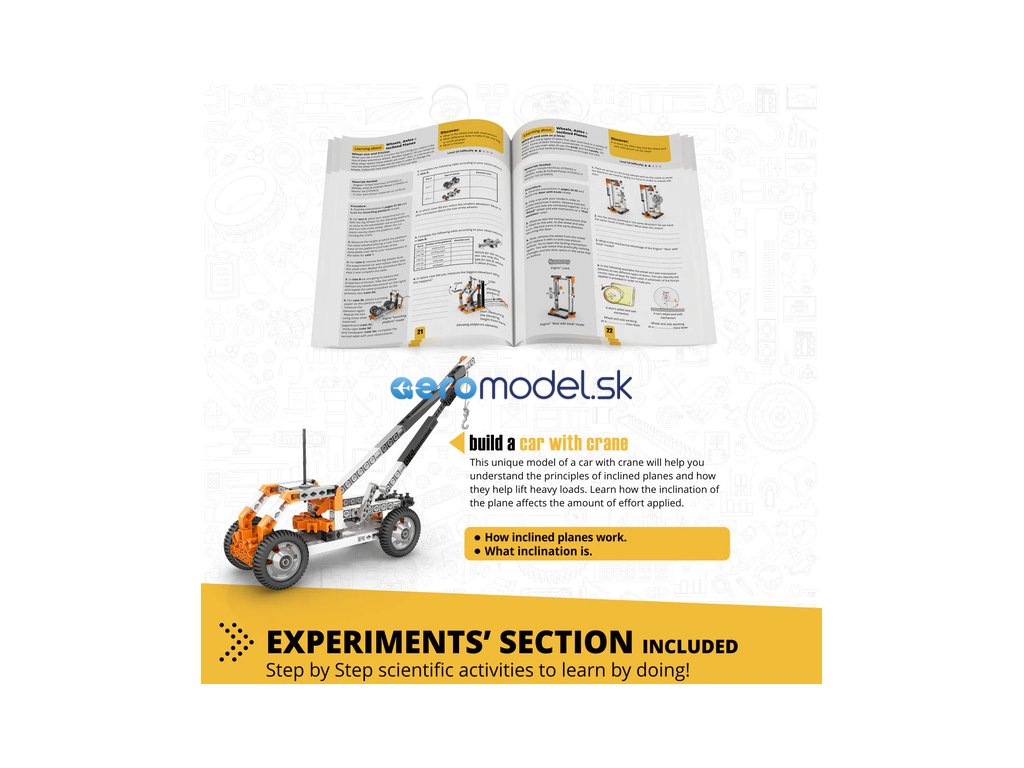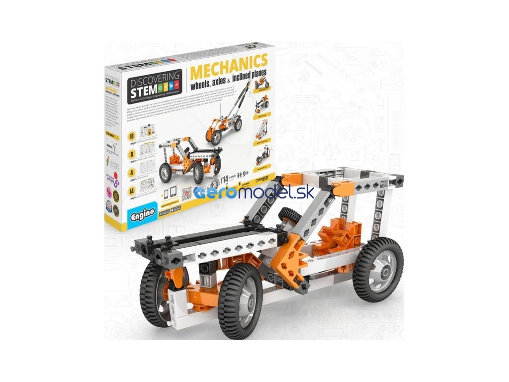 Stem Mechanics vám umožní zjistit, jak kola a nápravy pracují a na co se používají. Zjistěte, jak lze nakloněnou rovinu použít ke zvedání těžkých předmětů a jak se jiná nakloněná rovina, klín, používá v každodenních situacích. Postavte si 14 funkčních modelů, jako je odpalovací plošina, dveře s kličkou, studna, letištní schodiště, experimentální rampa a štípací klín. Jednoduché návody na sestavení všech modelů naleznete buď online, nebo v přiložené brožuře. Brožura poskytuje podrobná vysvětlení různých použitých vědeckých principů a zahrnuje inovativní experimentální aktivity pro praktické učení. K dispozici je také sekce Kvíz, ve které můžete otestovat své nově nabyté znalosti!