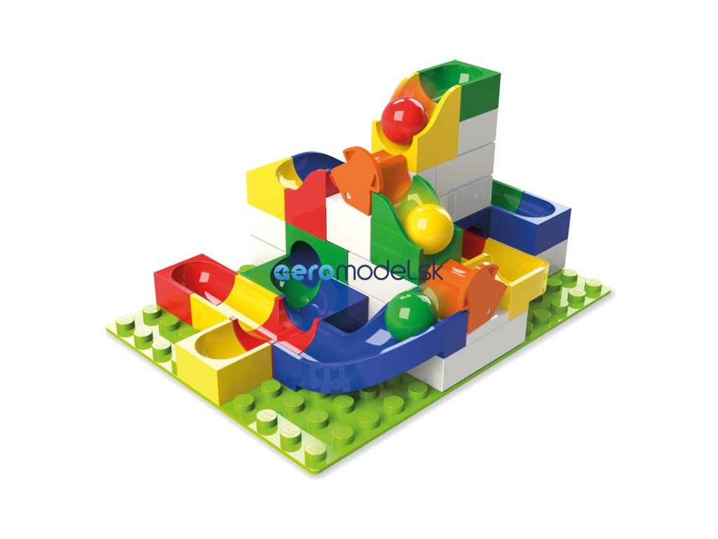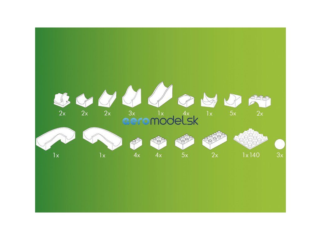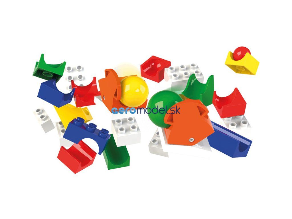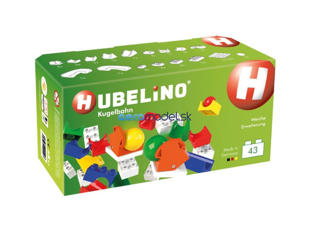 Guľôčková dráha Hubelino obsahuje: 37 stavebných dielov, 2 guľôčky, 2 výhybky, 1 základnú dosku