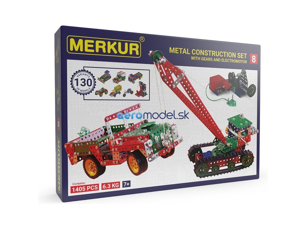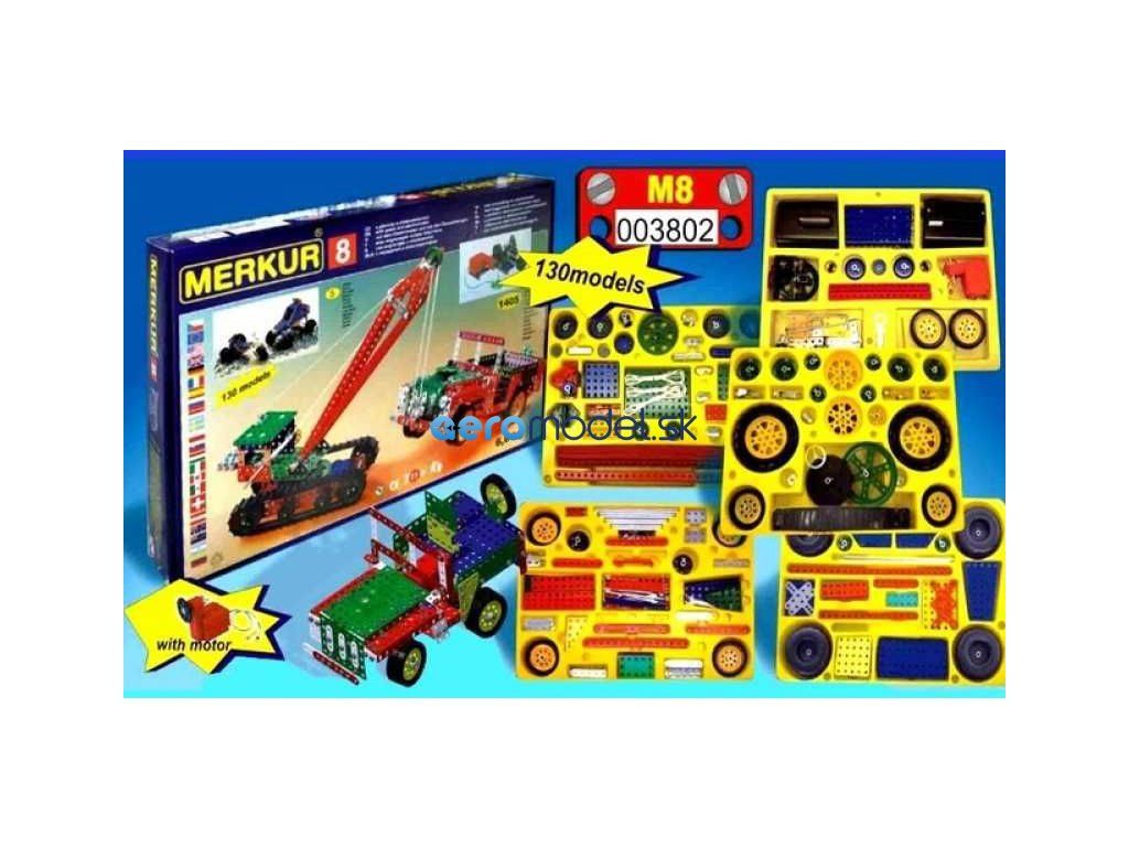 Merkur 8 je veľká päťvrstvová klasická stavebnica, vlajková loď stavebníc MERKUR - najväčšia a najlepšia. Stavebnica obsahuje 153 dielov - všetky typy, ktoré sa nachádzajú v menších stavebniciach, vrátane pásov, kolies traktora, ozubených kolies, prevodov, motora, dlhých uhlov, pásov atď. Zo stavebnice možno zostaviť aj modely terénnych vozidiel, veľkých strojov a vozidiel, ktoré sa dajú pohybovať pomocou prevodov a motora. Mladý konštruktér má k dispozícii veľké množstvo dielov, z ktorých si môže postaviť čokoľvek podľa vlastnej fantázie. Stavebnica sa dodáva s veľkou knihou s návodom na použitie.