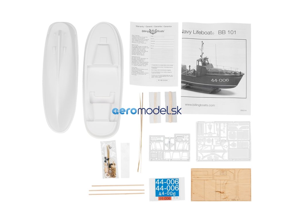 Záchranný člun Royal Navy má trup tvořený plastovým výliskem, plastovou palubu a dřevěnou nástavbu. Stavebnice obsahuje všechny plastové a dřevěné díly potřebné pro dokončení modelu, maketové příslušenství (např. poziční světla, kotvu, záchranné kruhy, lodní šroub atd.).
