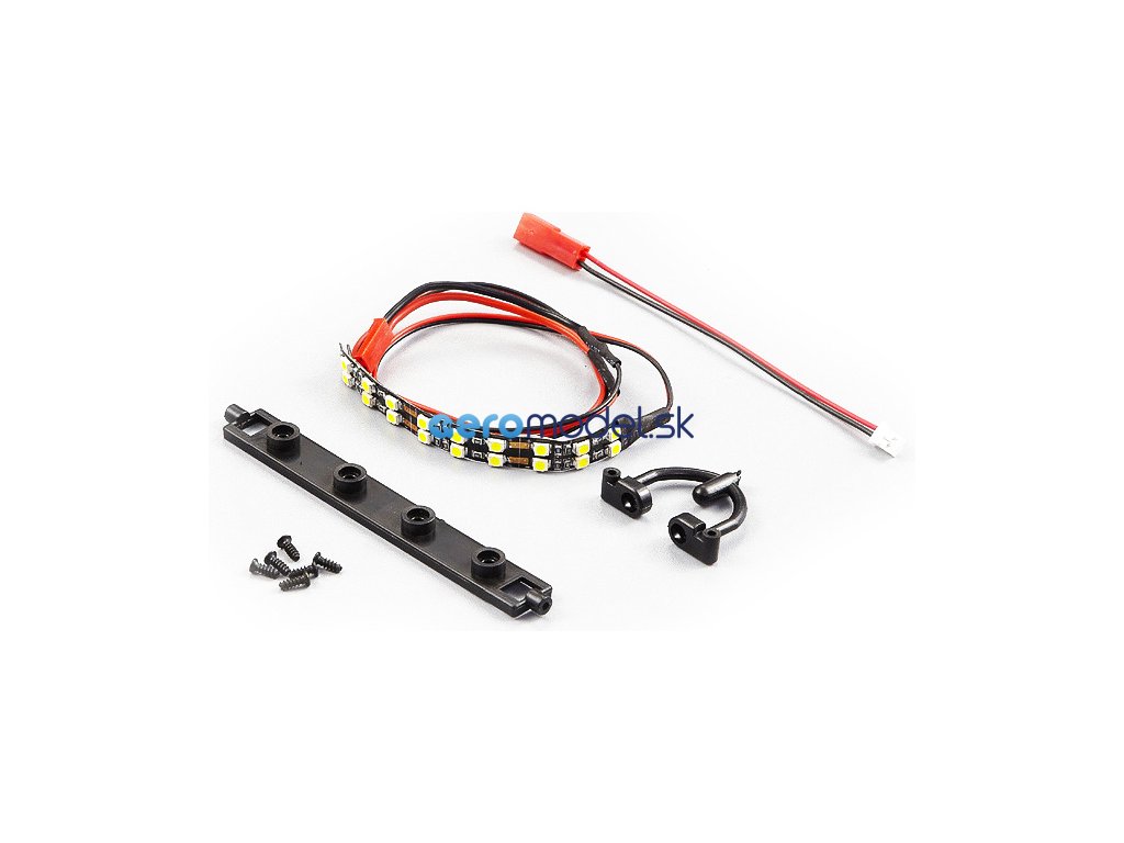 Díky zadní lepící straně pásu se dá lehce připevnit k černému plastovému rámu. Ten se pomocí montážní sady přidělá třeba ke střešnímu nosiči na karoserii modelu auta. LED pás obsahuje 18 diod, které svítí bíle.