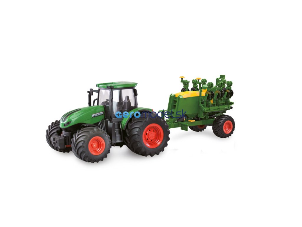 Veľmi pekne spracovaný RC model traktora s prívesom na diaľkové ovládanie. Prevedenie modelu je naozaj krásne, prednosťou modelu sú tiež veľké široké kolesá, predné svetlá a zvuk motora. Ďalšia prednosť je pomalá jazda, sprevodovaná do sily tak ako to pri traktore má byť! Slušná vydrž akumulátora umožňuje jazdu až 35 minút. Akumulátor v traktore je meniteľný. Ovládač modelu nemá anténu ani páčky a to je dobré, pretože deti nemajú čo zlomiť.
