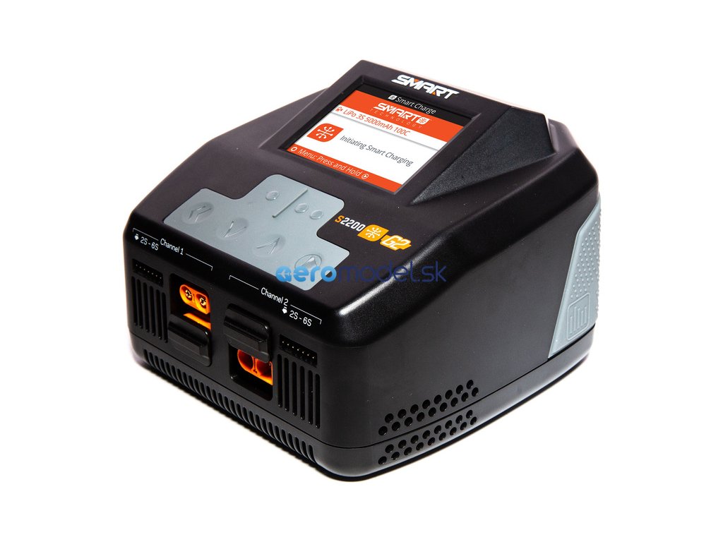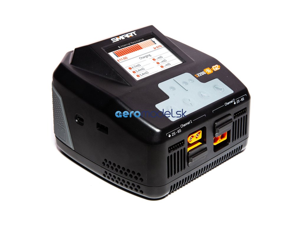 Nabíječ Spektrum Smart G2 S2200 2x200W AC nové generace se dvěma výstupy po 200W a technologií SMART, přináší nejmodernější uživatelsky přívětivé prostředí, ovládání tlačítky, výstup s konektory IC3/IC5, 2x konektor balancéru JST-XH, displej 320 × 240 IPS LCD a USB výstup 5V / 2A pro externí zařízení.