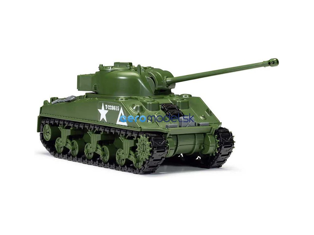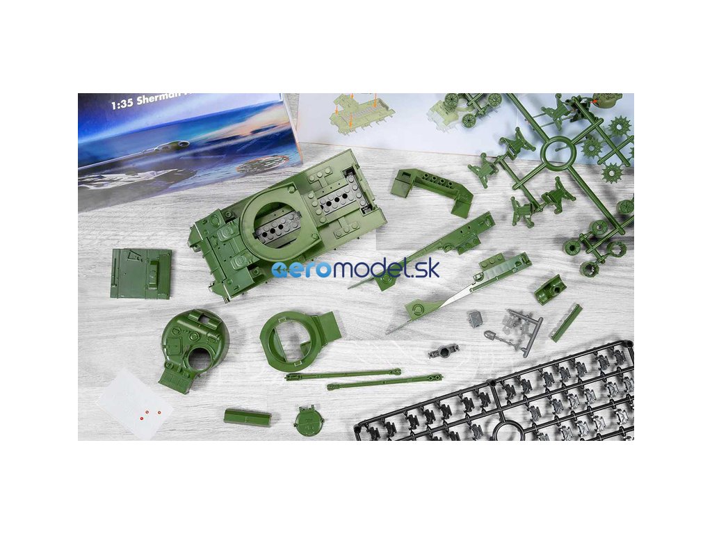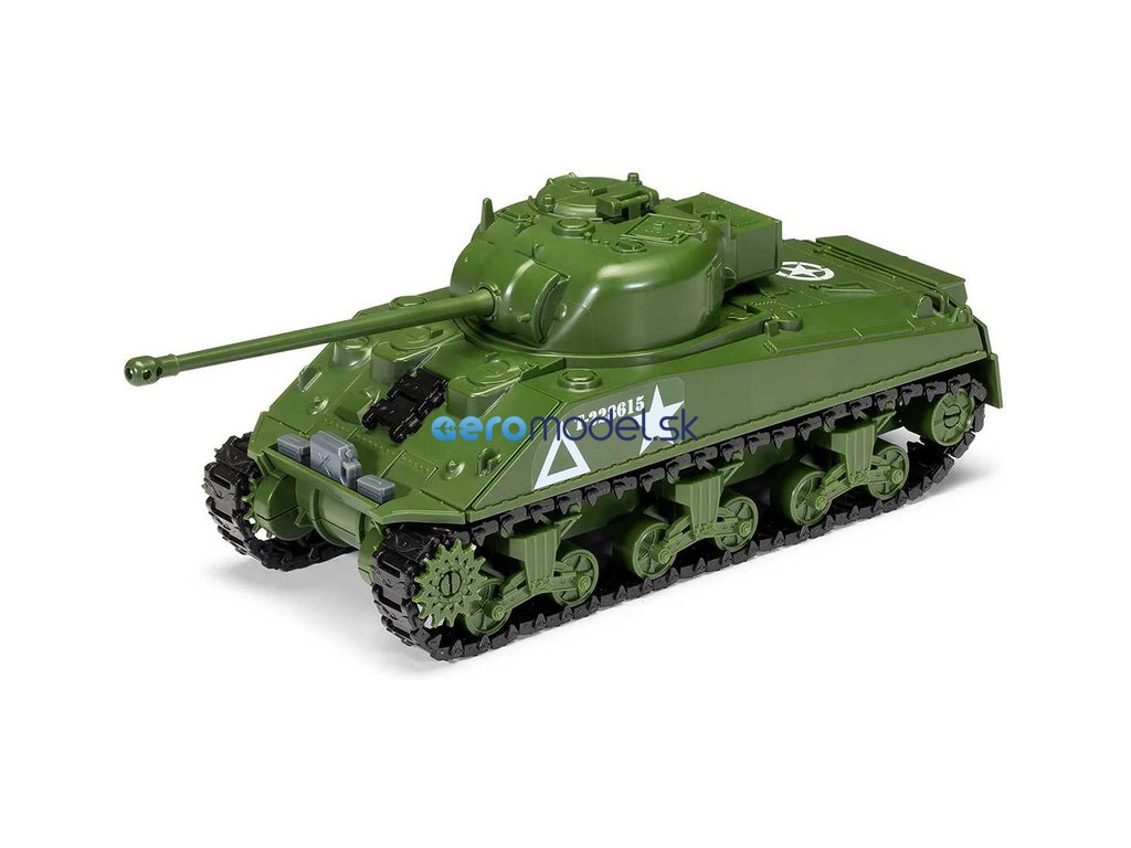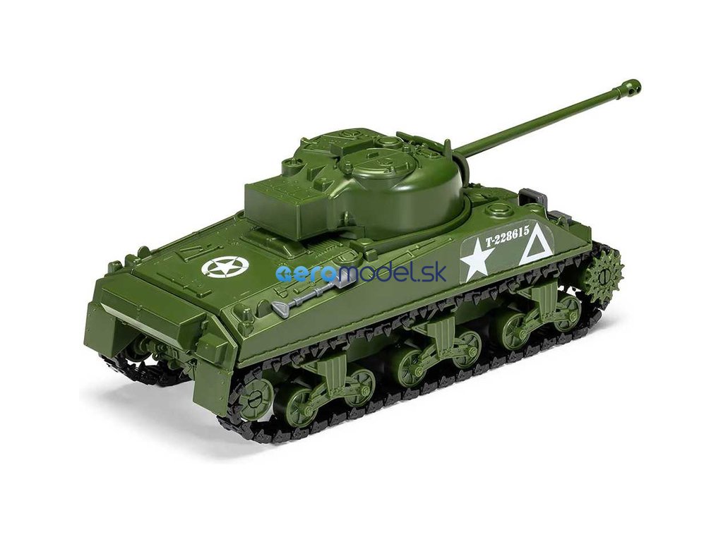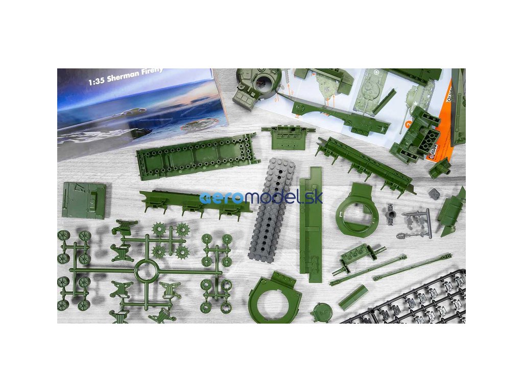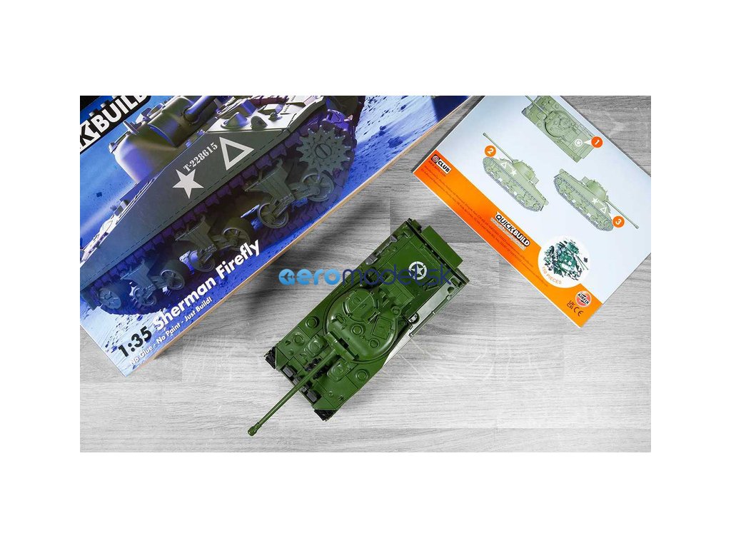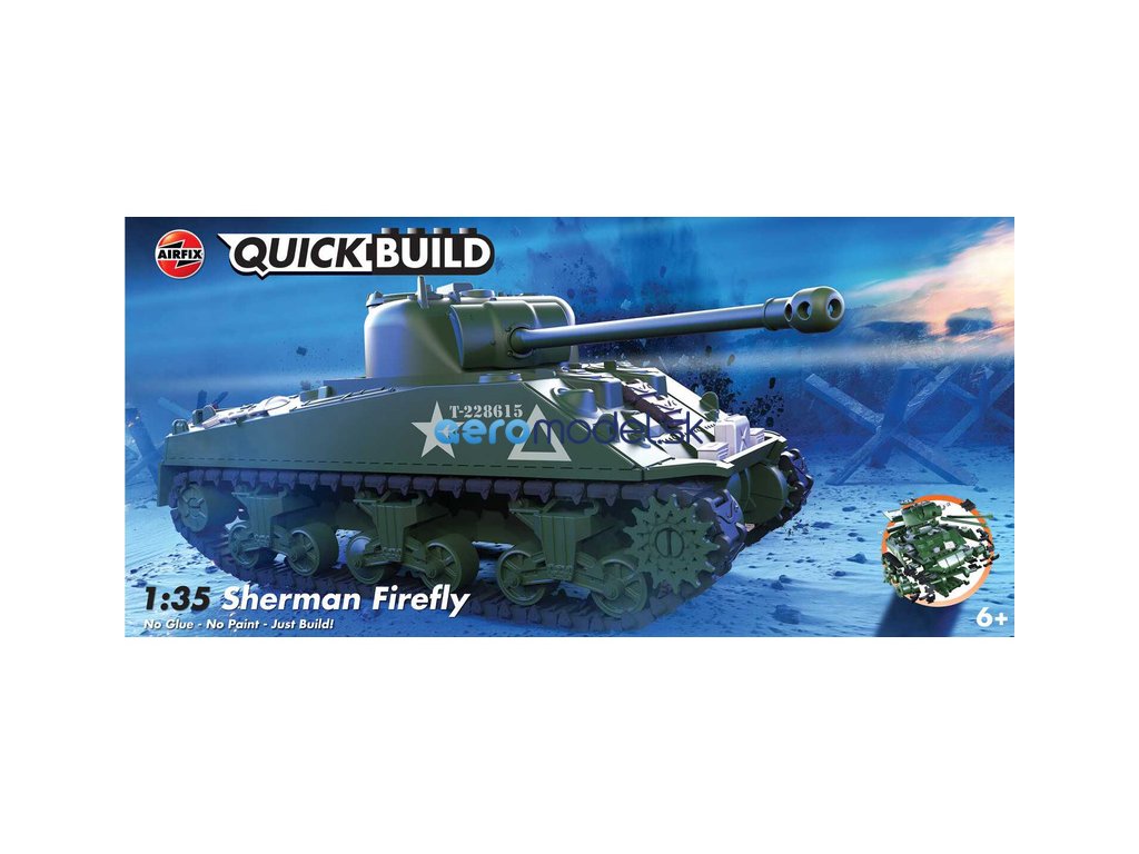 Plastikový model Airfix Quick Build J6042 – tank Sherman Firefly v měřítku 1:35. Stavebnice obsahuje 154 dílků, délka 226 mm, obtížnost 1.