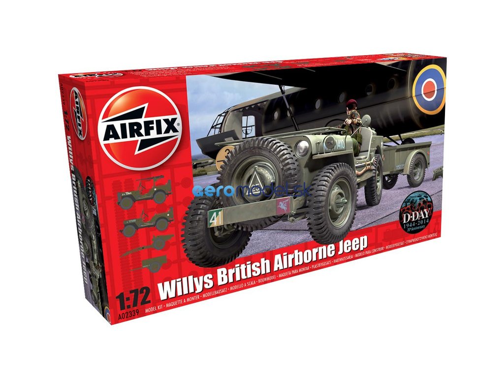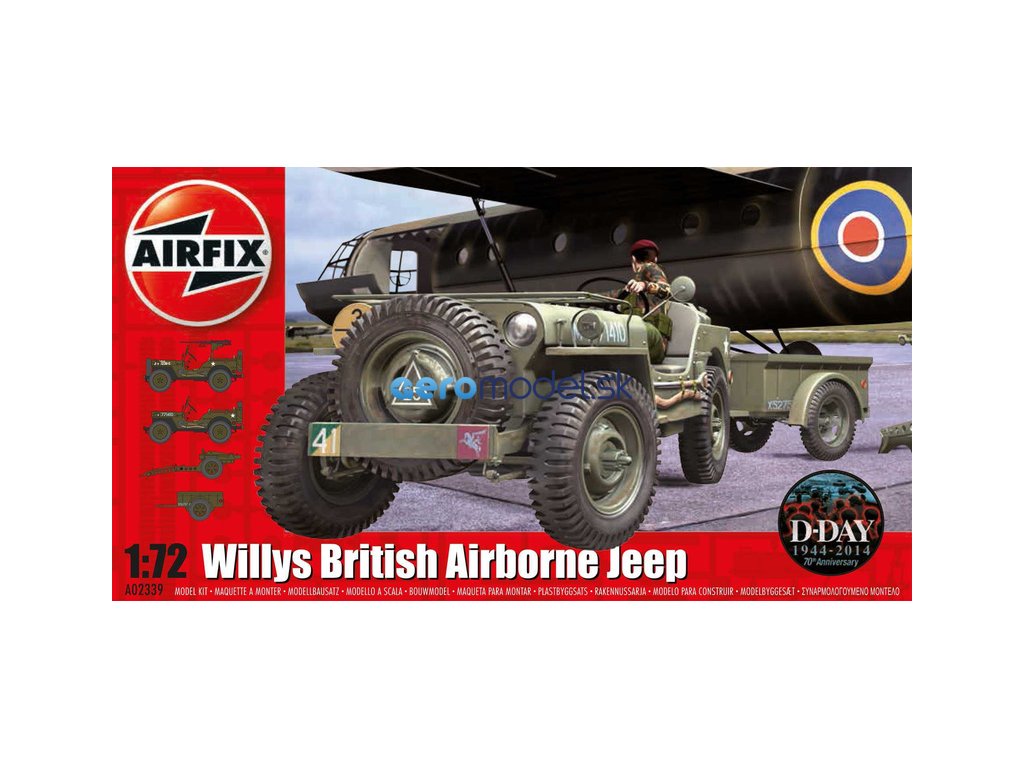 Plastikový model Airfix A02339 - vojenský džíp Willys, príves a delo 6PDR v mierke 1:72 na zlepenie. Stavebnica obsahuje 71 dielikov, džíp; príves; húfnica, obtiažnosť 1.