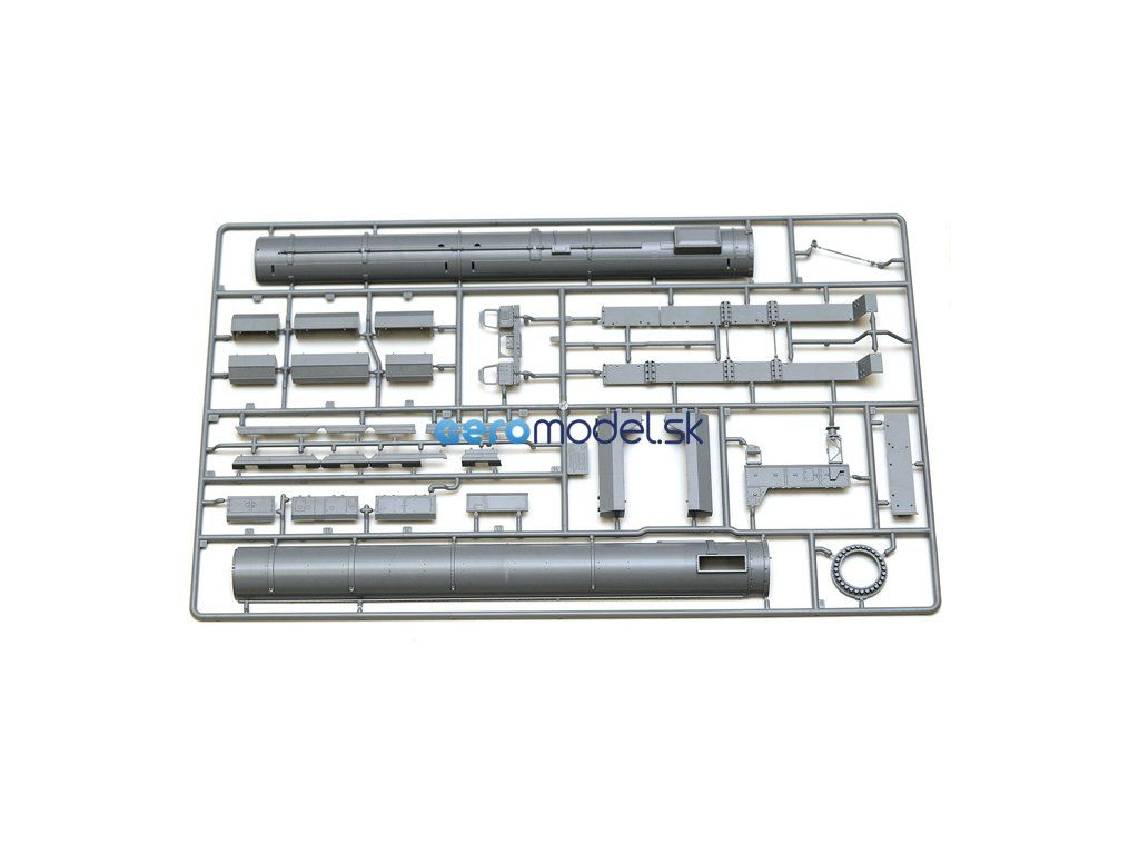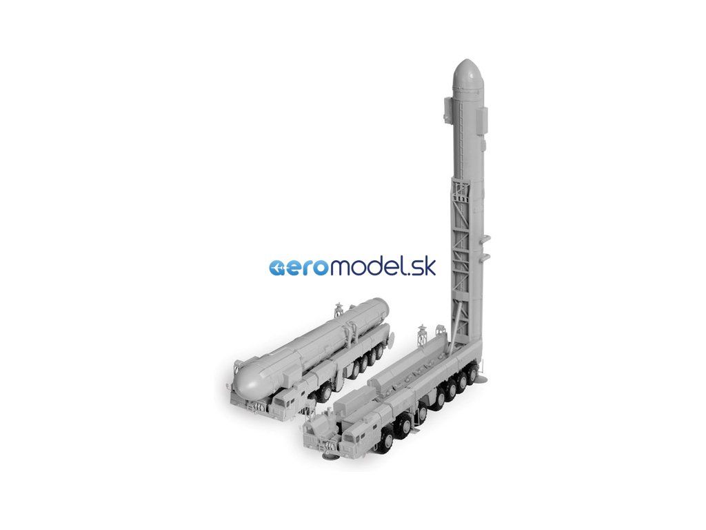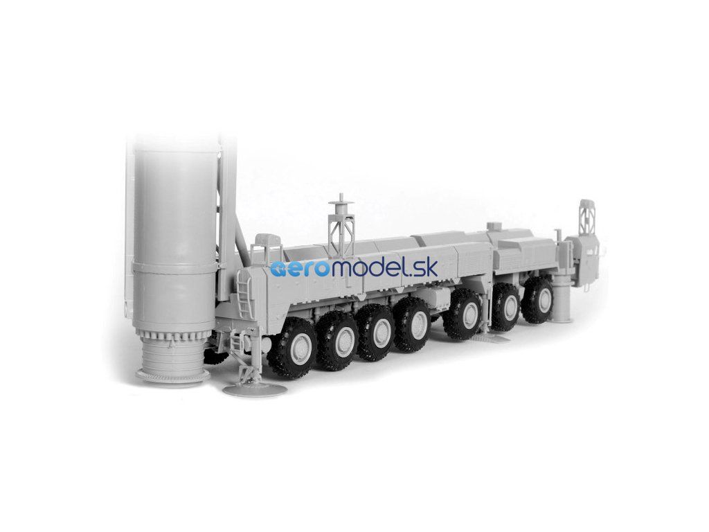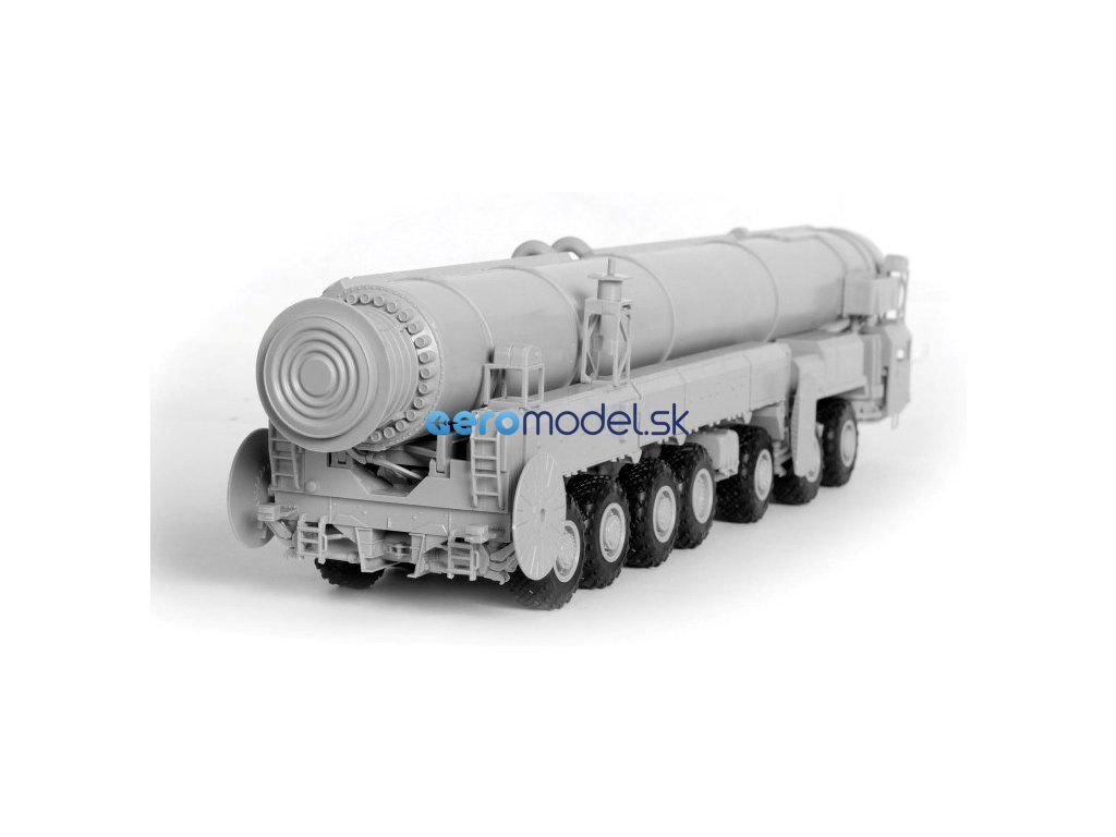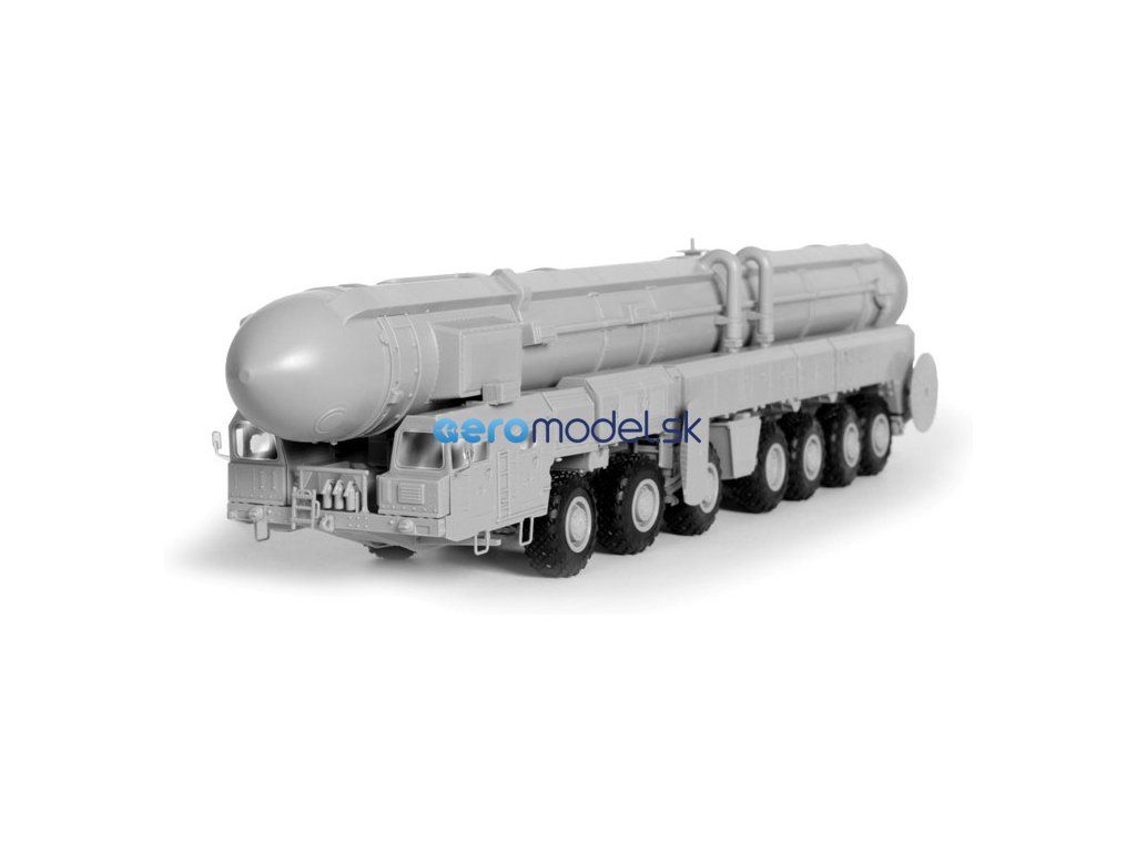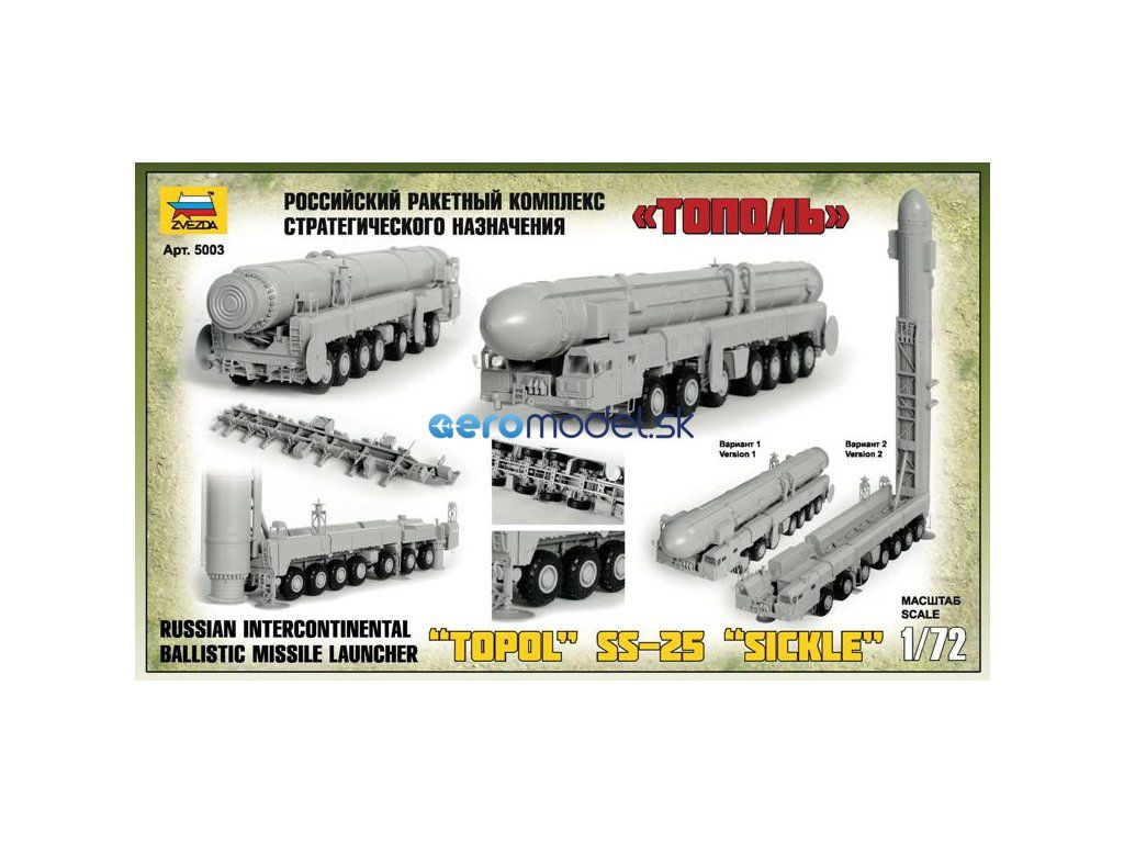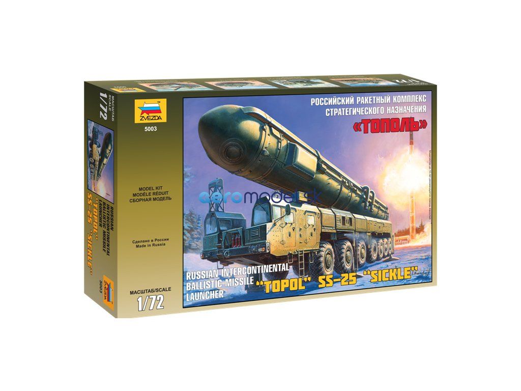 Plastikový model Zvezda 5003 - ruský strategický raketový systém "Topol" v mierke 1:72 na zlepenie. Stavebnica obsahuje 309 dielikov, dĺžka 310 mm, obtiažnosť 3.